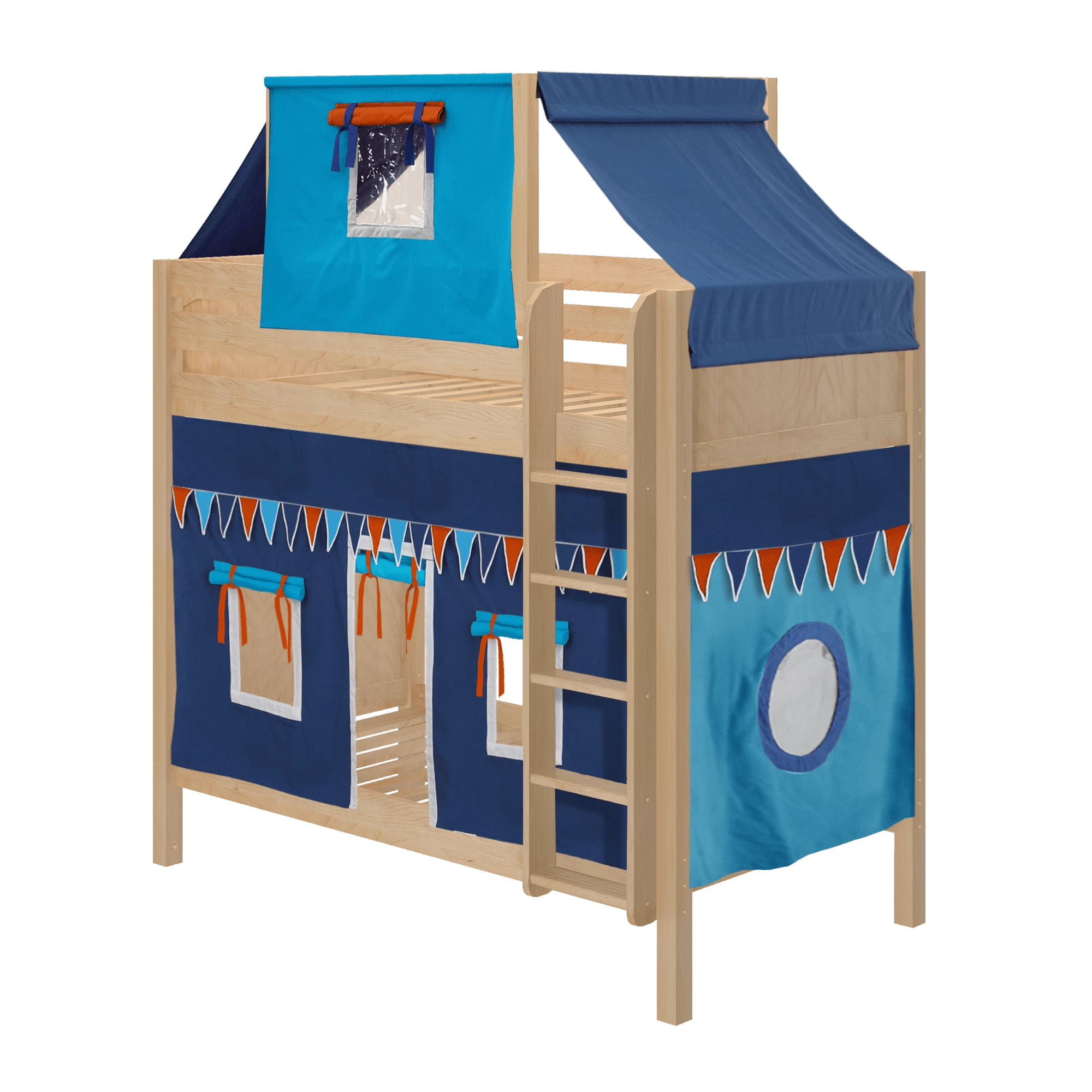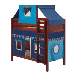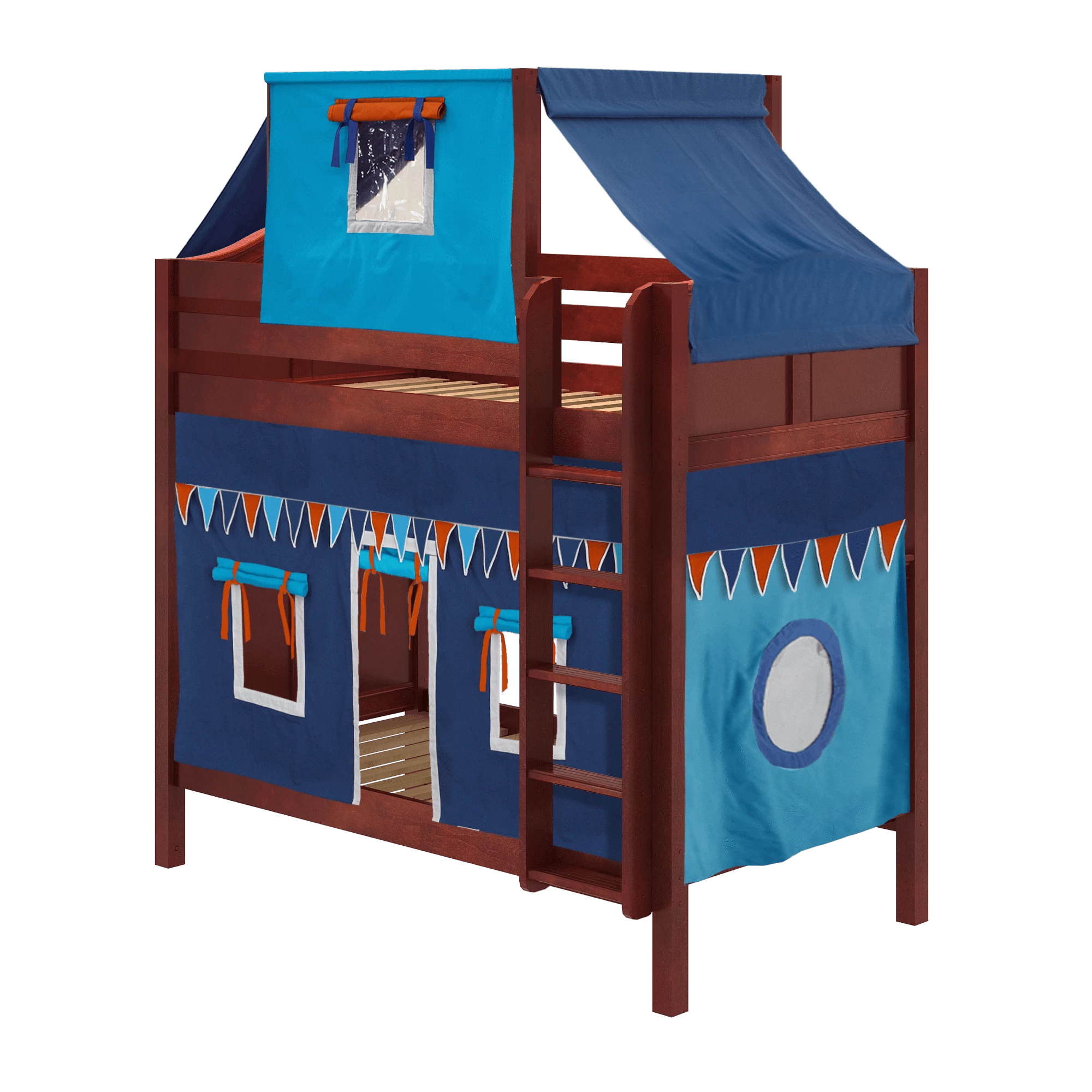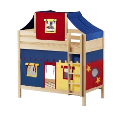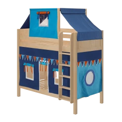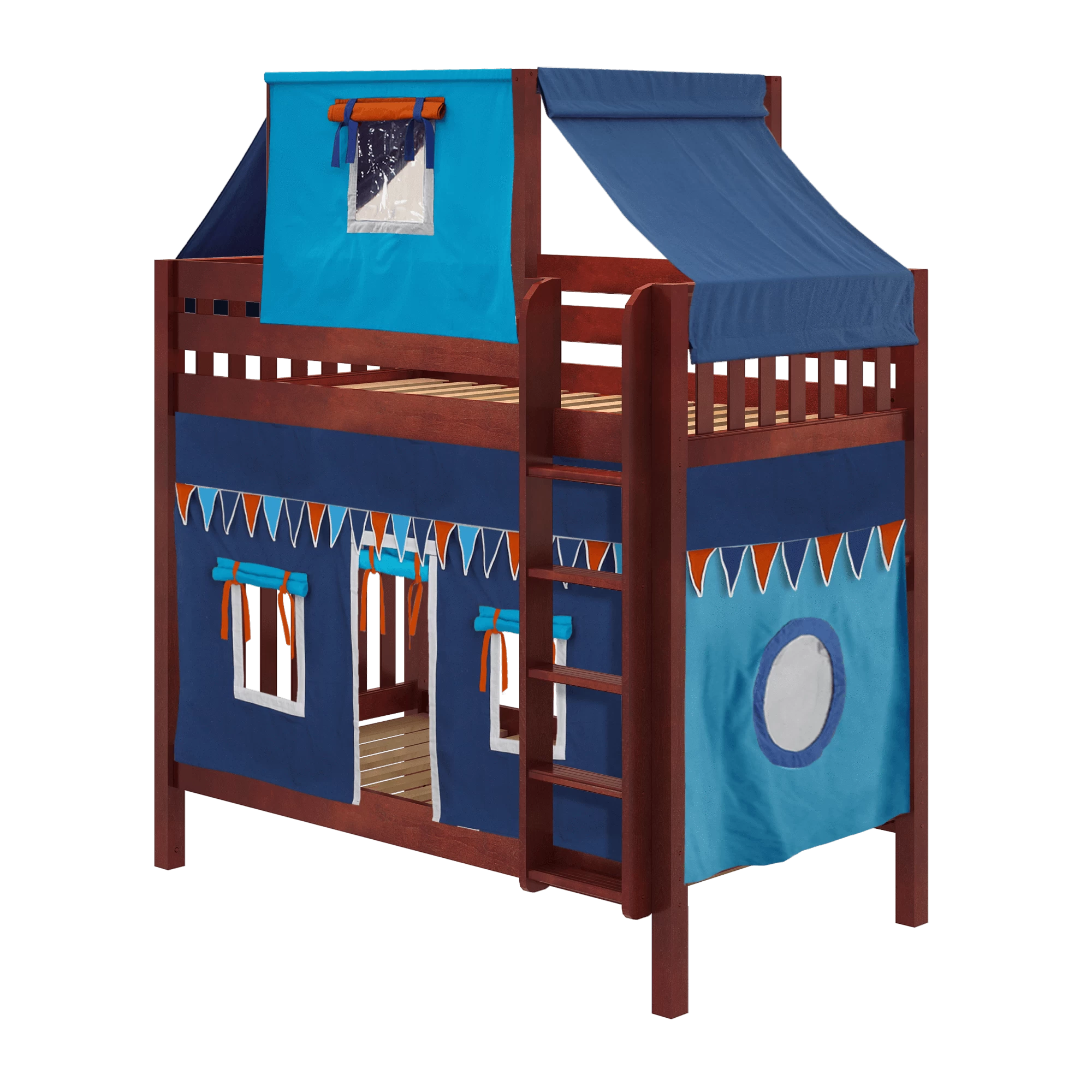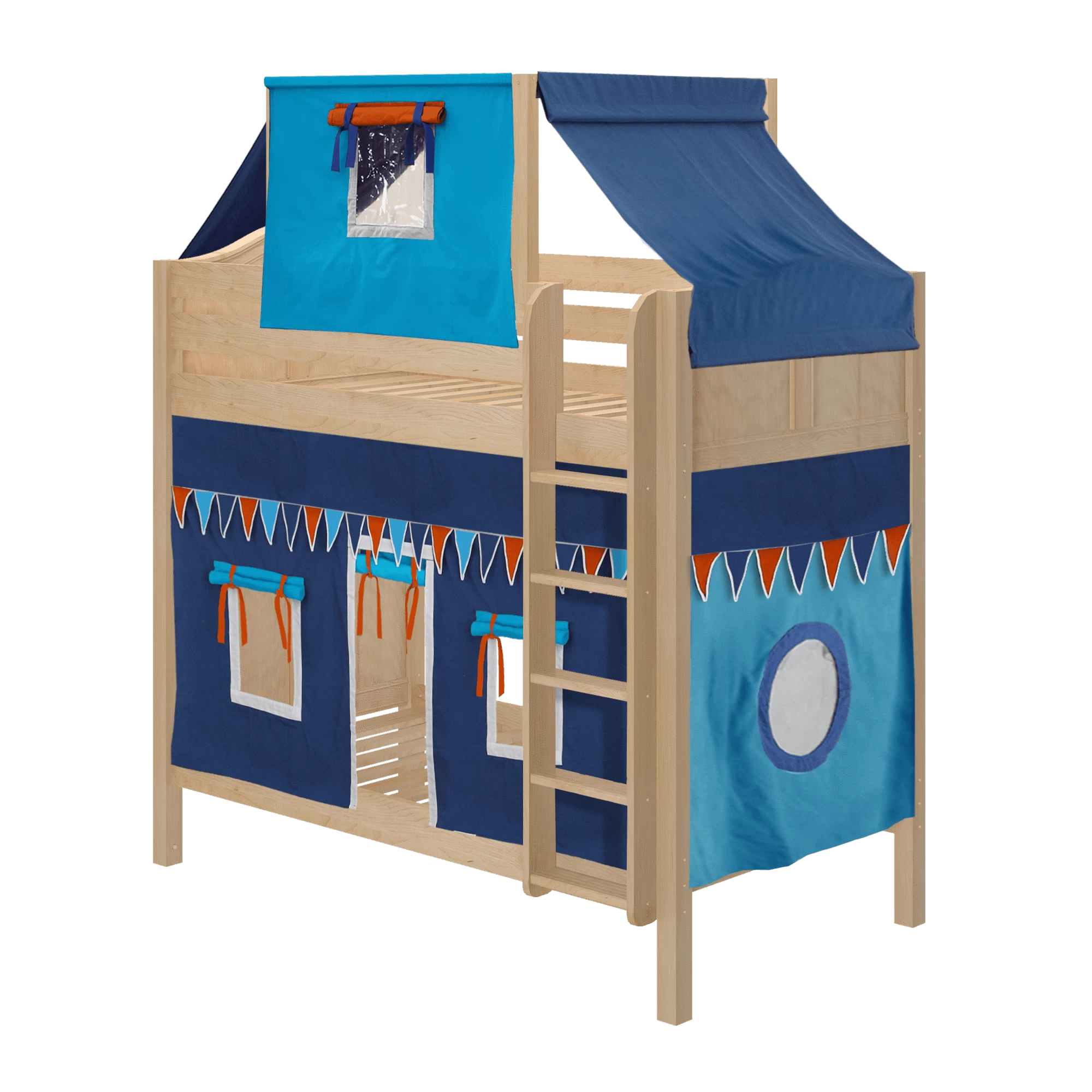 Colorful fabrics put a playful spin on our classic high bunk bed with straight ladder! Curtains + matching top tent will inspire your child’s imagination during the day and help them sleep soundly at night. 3.5 ft of space between top and bottom allows taller kids and adults to sit up comfortably.