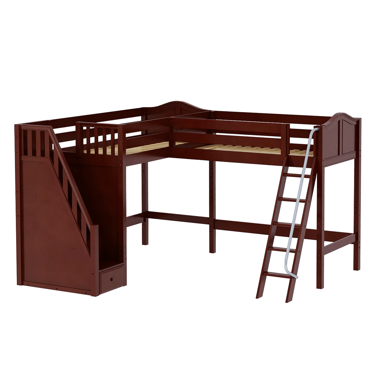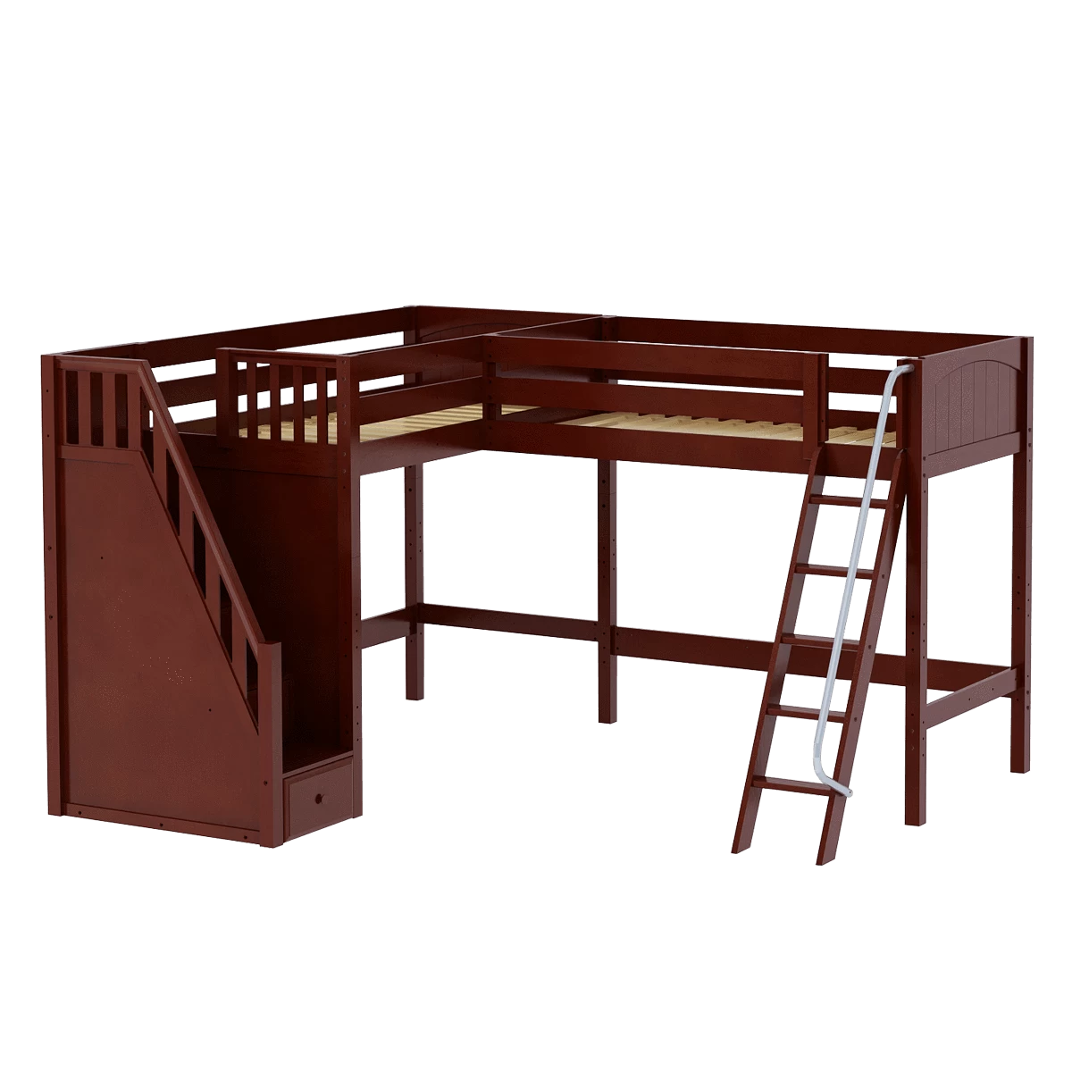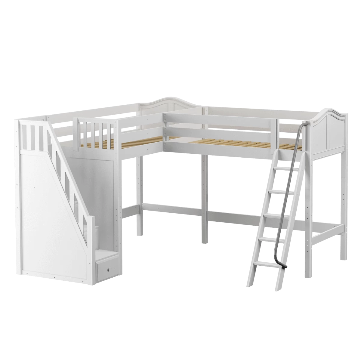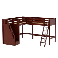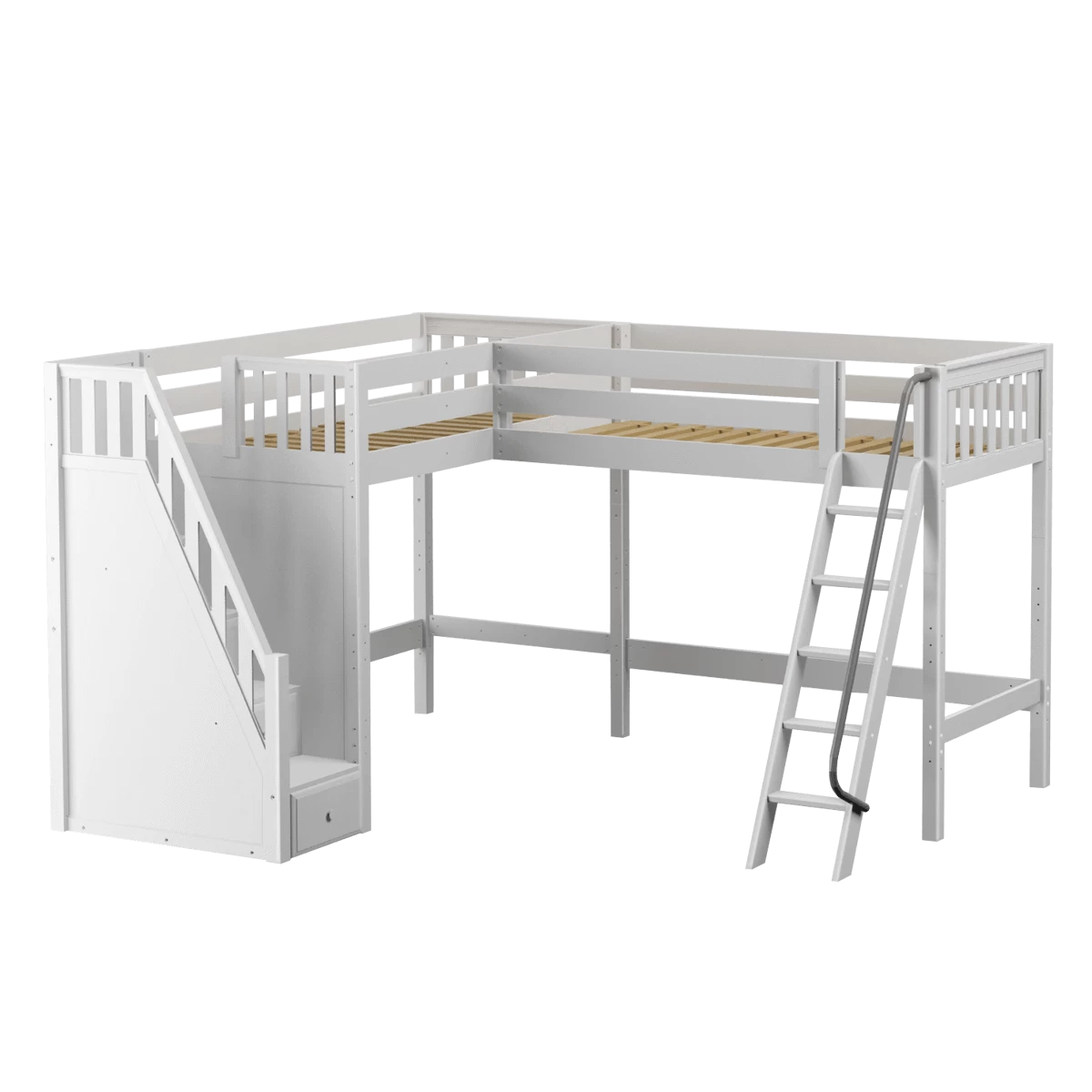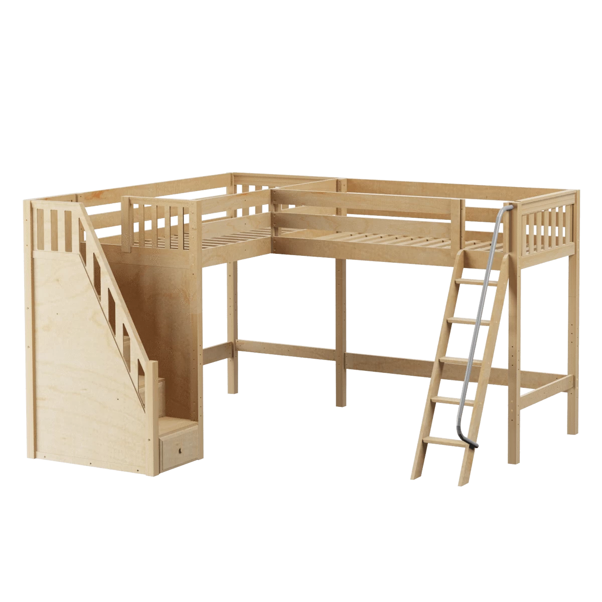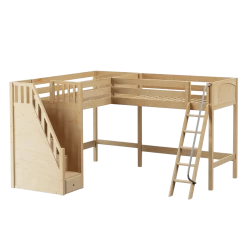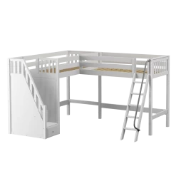 Two high lofts connected to form an “L” shape that fits perfectly in a bedroom corner, saving valuable floorspace. Over 4 ft of underbed clearance, ideal for a desk, storage or play space. Staircase is safe and easy to climb, plus each step doubles as a storage drawer.