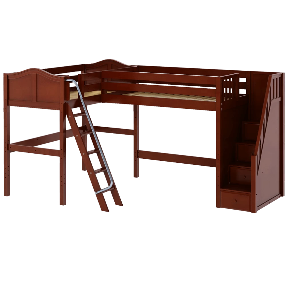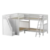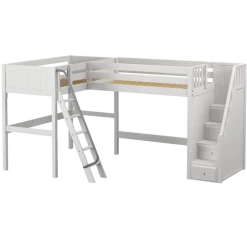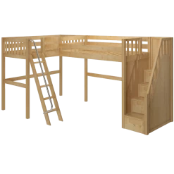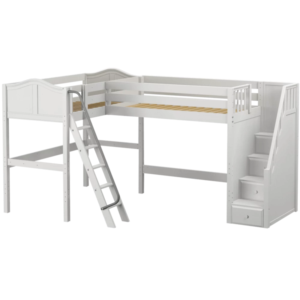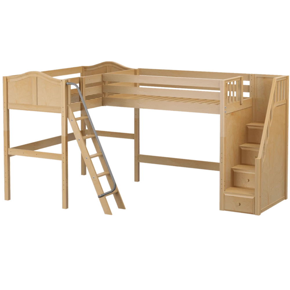 Two high lofts connected to form an “L” shape that fits perfectly in a bedroom corner, saving valuable floorspace. Over 4 ft of underbed clearance, ideal for a desk, storage or play space. Staircase is safe and easy to climb, plus each step doubles as a storage drawer.