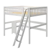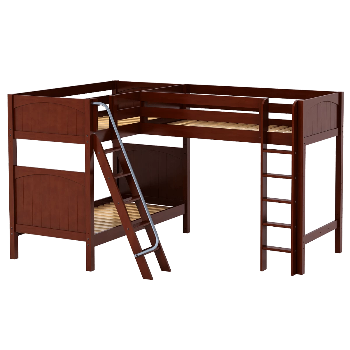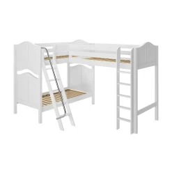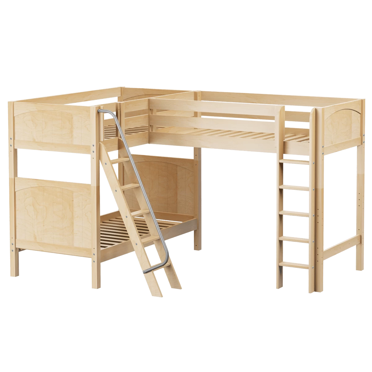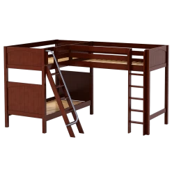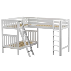 Our high corner loft bunk is just that – two beds stacked on one side connected to a single raised bed on the other. The result is a super functional “L” shape that fits perfectly in your bedroom corner.