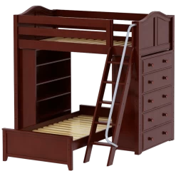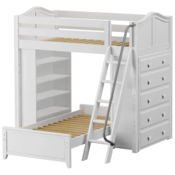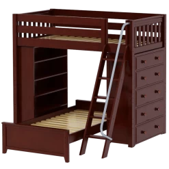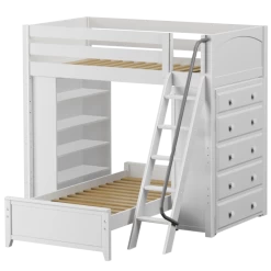 The ultimate all-in-one solution for your child’s bedroom! Lofted bed makes room for another bed to slide in below perpendicular. Our perfectly sized bookcase on one end, and dresser on the other add much needed storage without losing valuable floorspace.