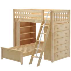 The ultimate all-in-one solution for your child’s bedroom! Lofted bed makes room for another bed to slide in below perpendicular. Our perfectly sized bookcase on one end, and dresser on the other add much needed storage without losing valuable floorspace.