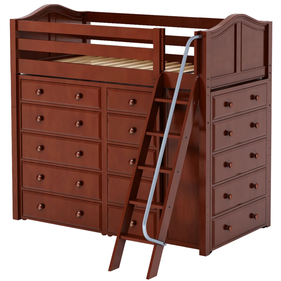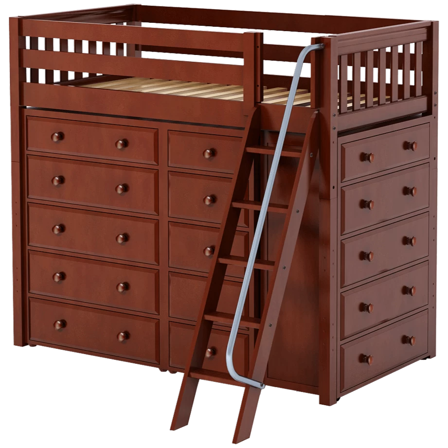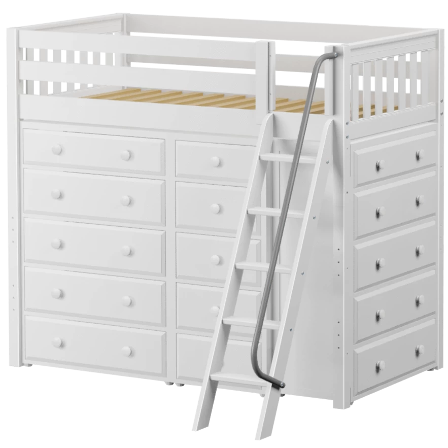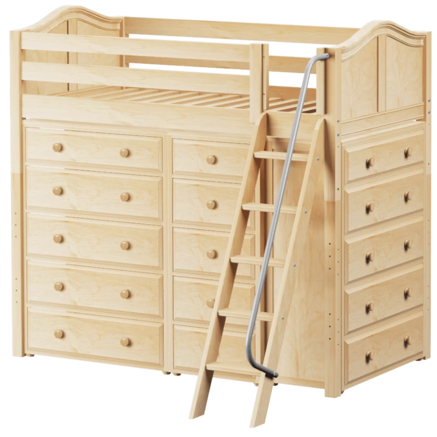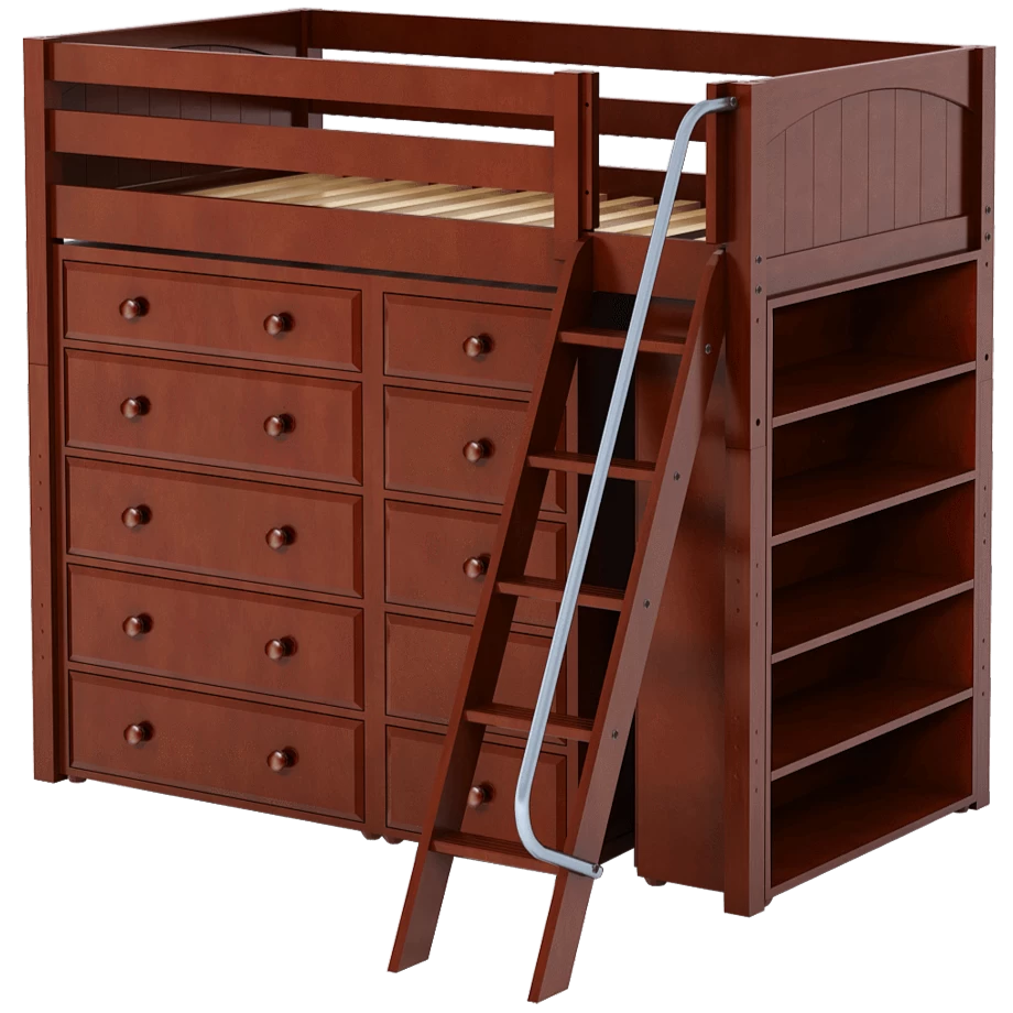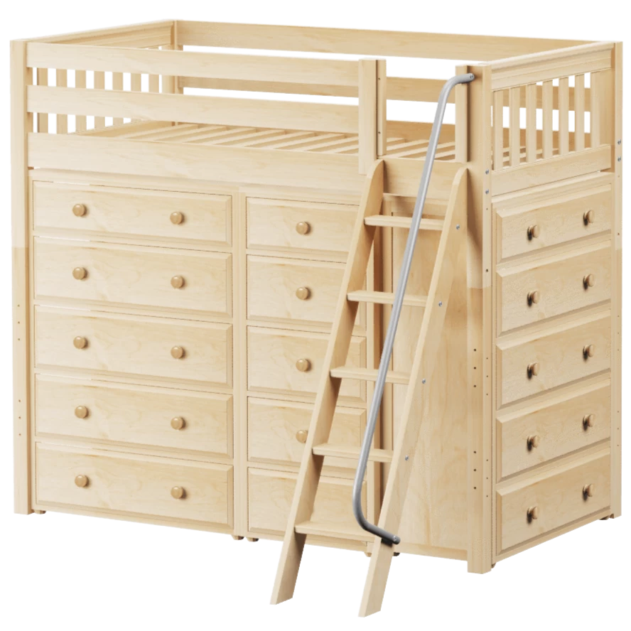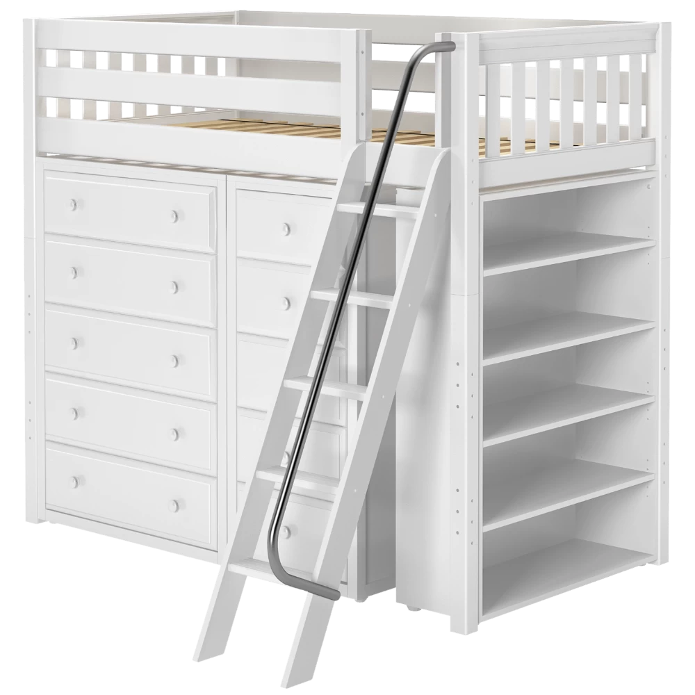 Our classic high loft bed with angled ladder becomes the ultimate storage cube! Raised bed = space underneath. Fill with matching case goods based on your needs. Dressers + bookcases are designed to fit perfectly. Each piece is freestanding so you can use separately for years to come.