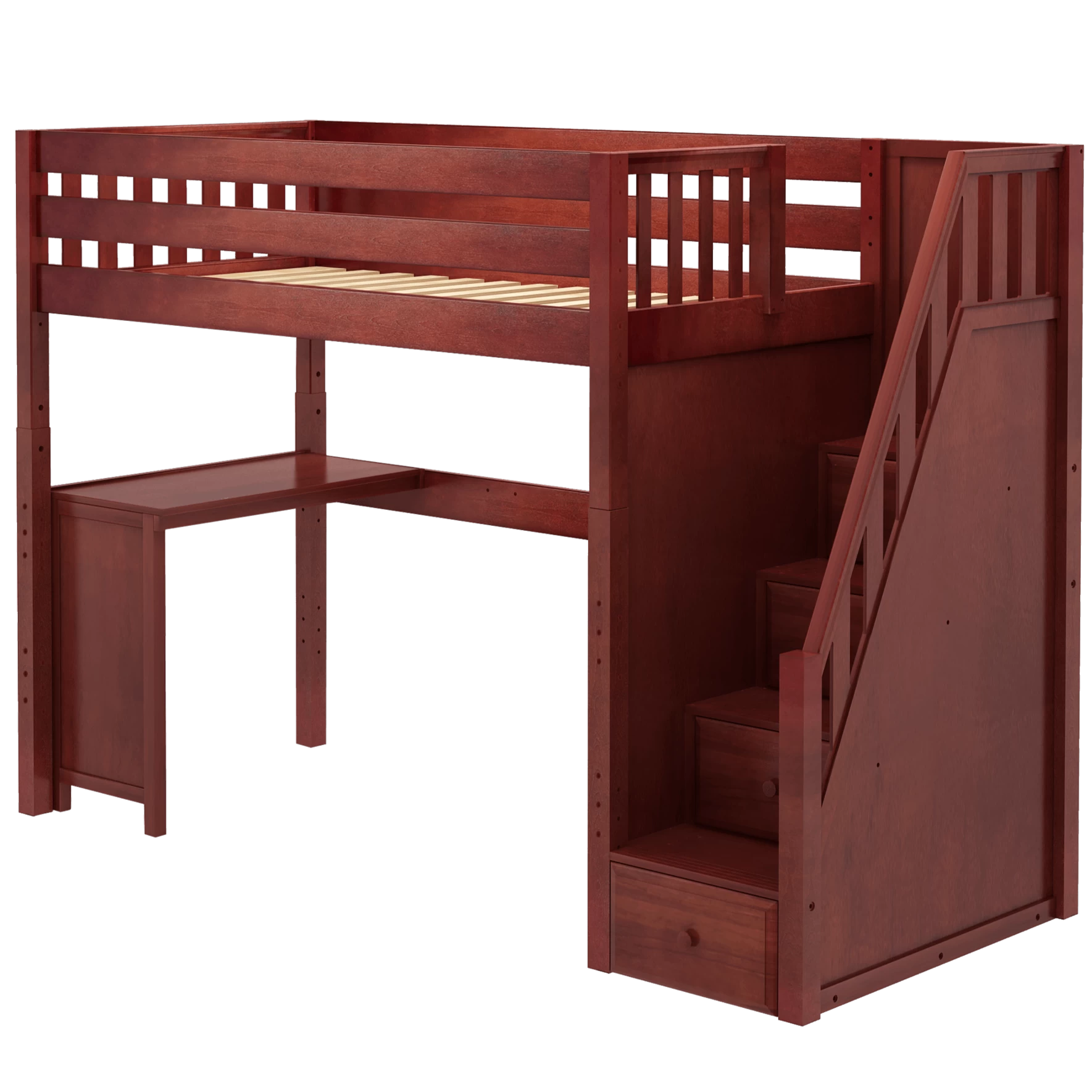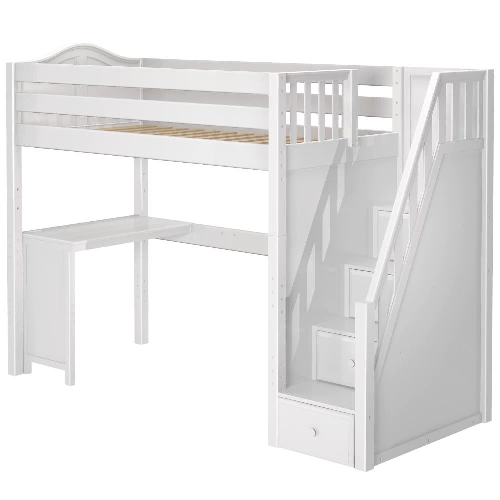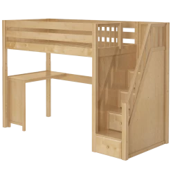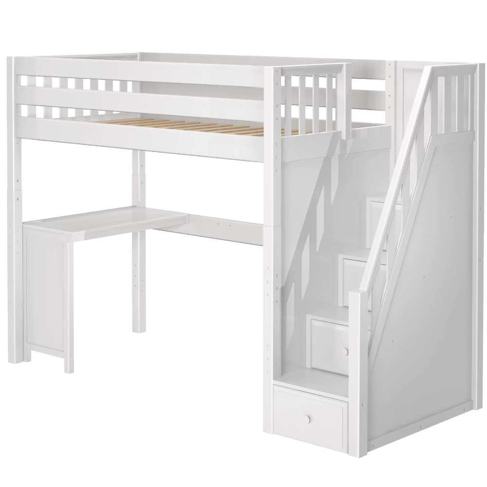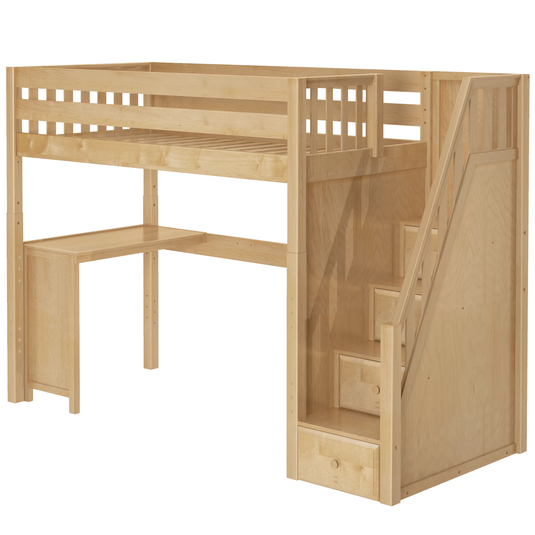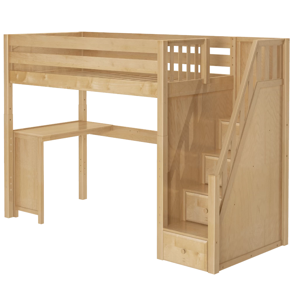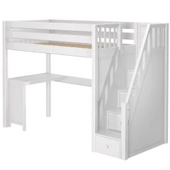 Our high loft with stairs becomes the ultimate sleep + study combo! Attached matching desk creates a functional spot for schoolwork and frees up valuable floorspace in your child’s bedroom. Easy to climb staircase steps double as storage drawers.