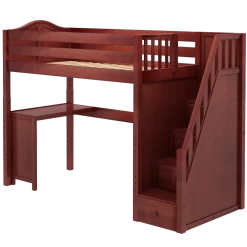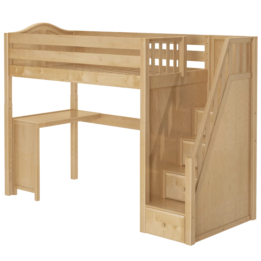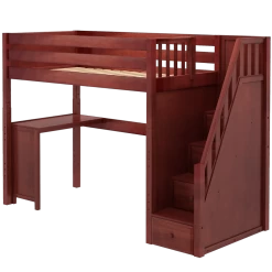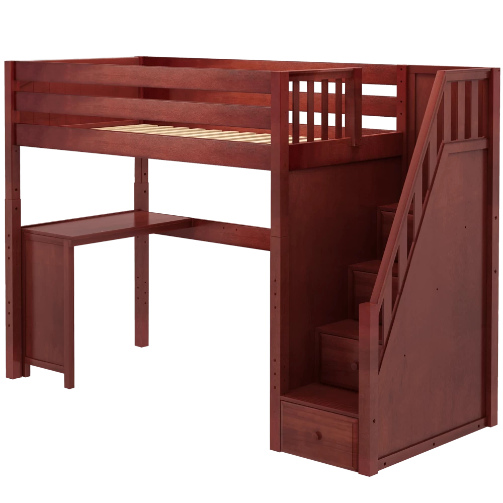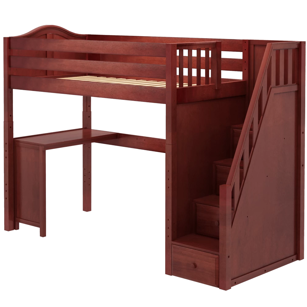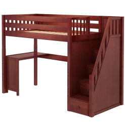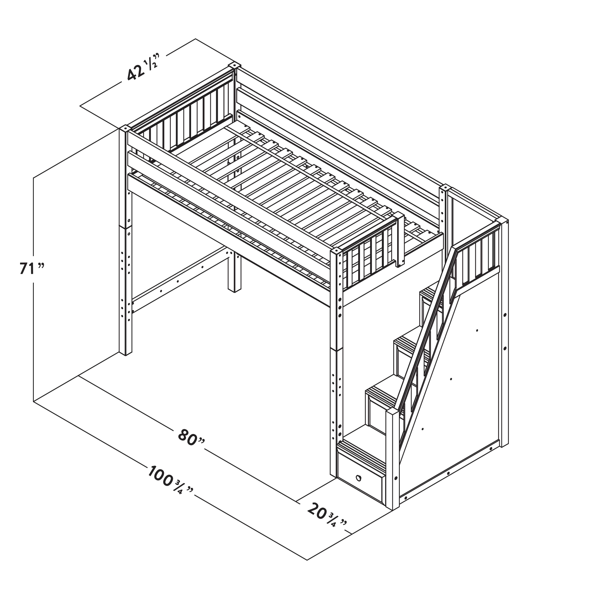 Our high loft with stairs becomes the ultimate sleep + study combo! Attached matching desk creates a functional spot for schoolwork and frees up valuable floorspace in your child’s bedroom. Easy to climb staircase steps double as storage drawers.