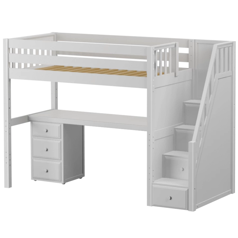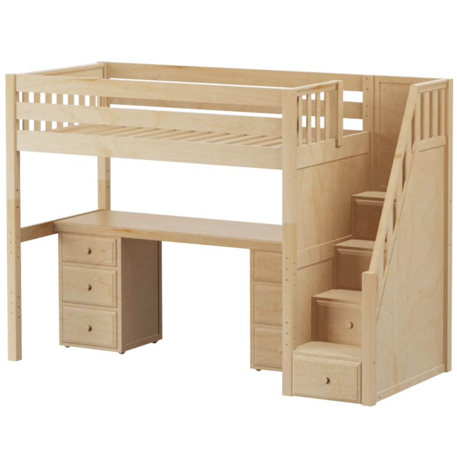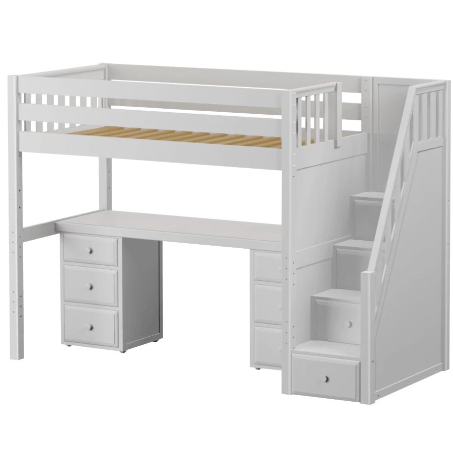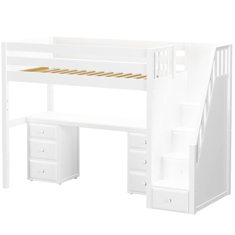 Our high loft with stairs becomes the ultimate sleep + study combo! Attached matching desk creates a functional spot for schoolwork and frees up valuable floorspace in your child’s bedroom. Easy to climb staircase steps double as storage drawers.