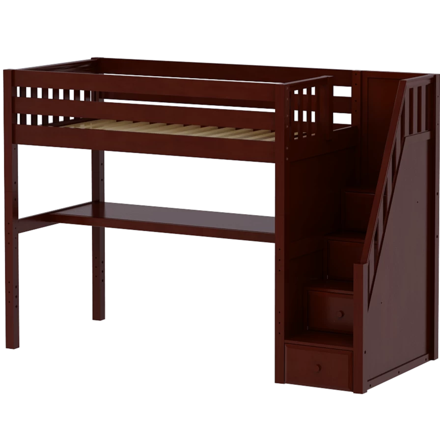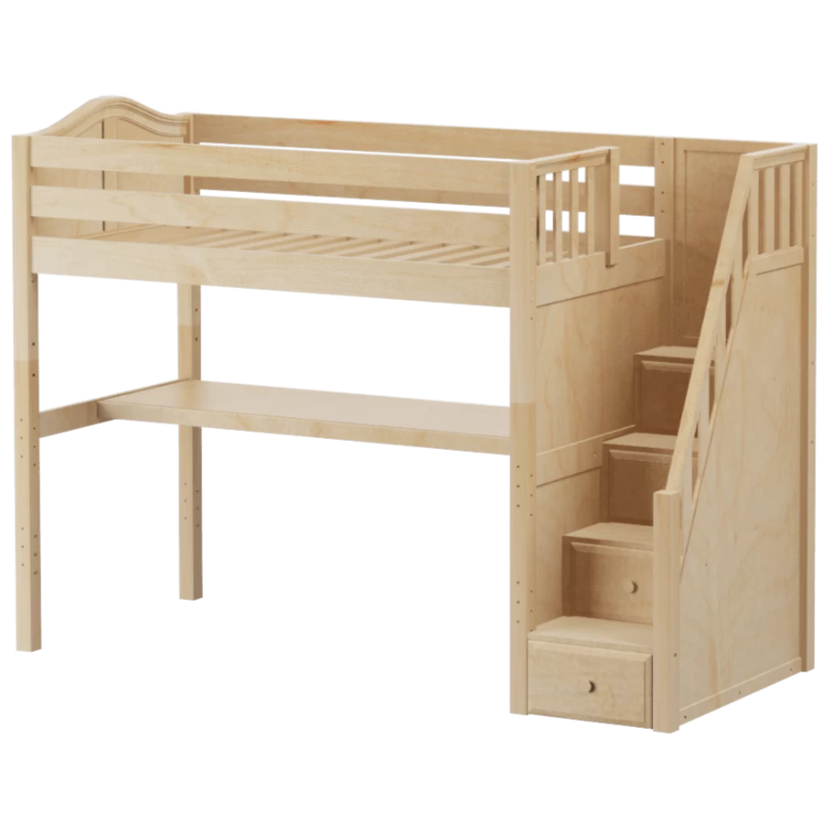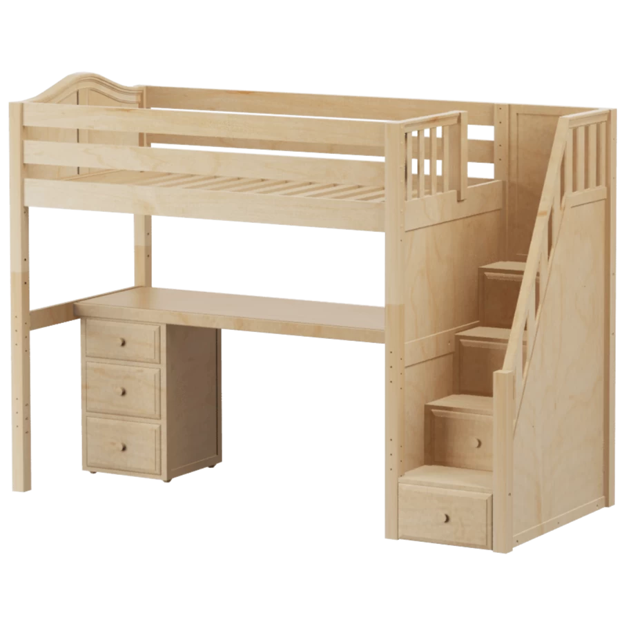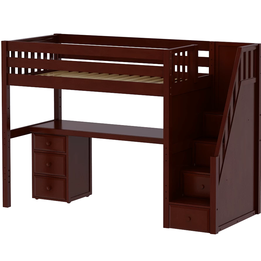 Our high loft with stairs becomes the ultimate sleep + study combo! Attached matching desk creates a functional spot for schoolwork and frees up valuable floorspace in your child’s bedroom. Easy to climb staircase steps double as storage drawers.