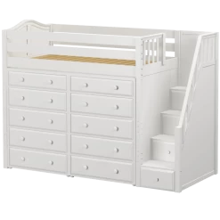 Our best-selling high loft bed becomes the ultimate storage cube. Matching dressers slide in perfectly beneath the bed, saving valuable floorspace. Added bonus, super safe staircase steps double as storage drawers.