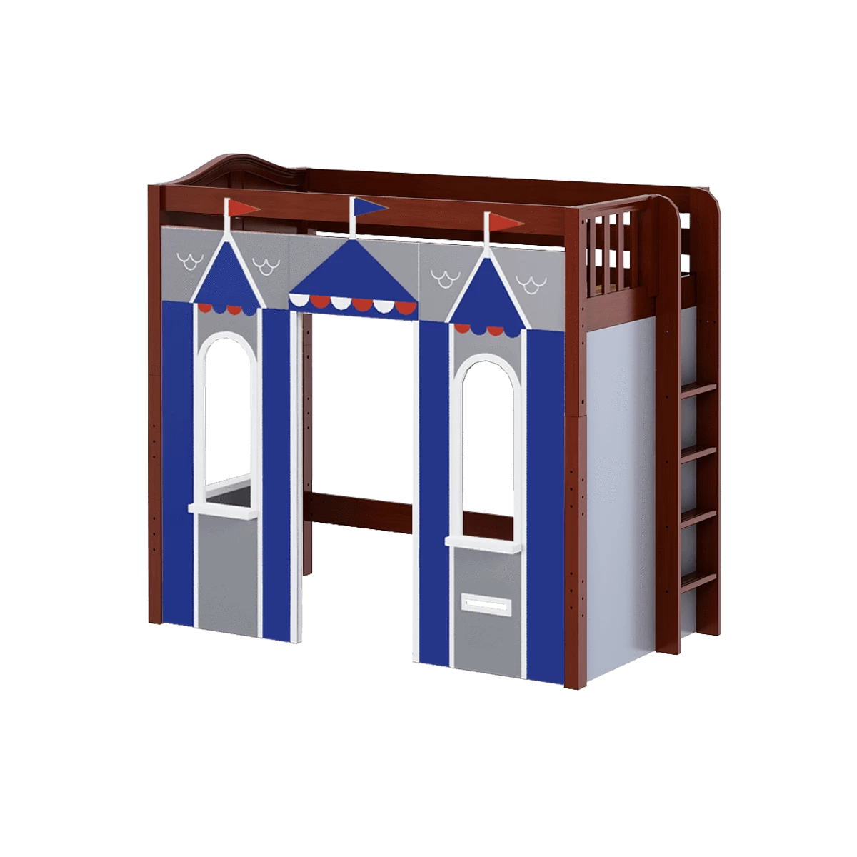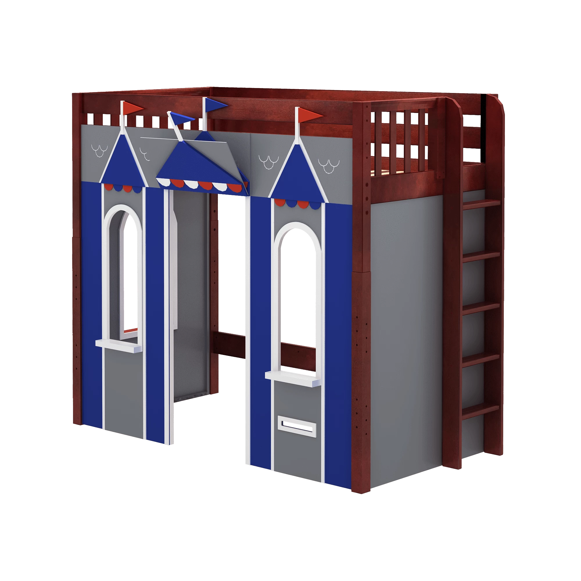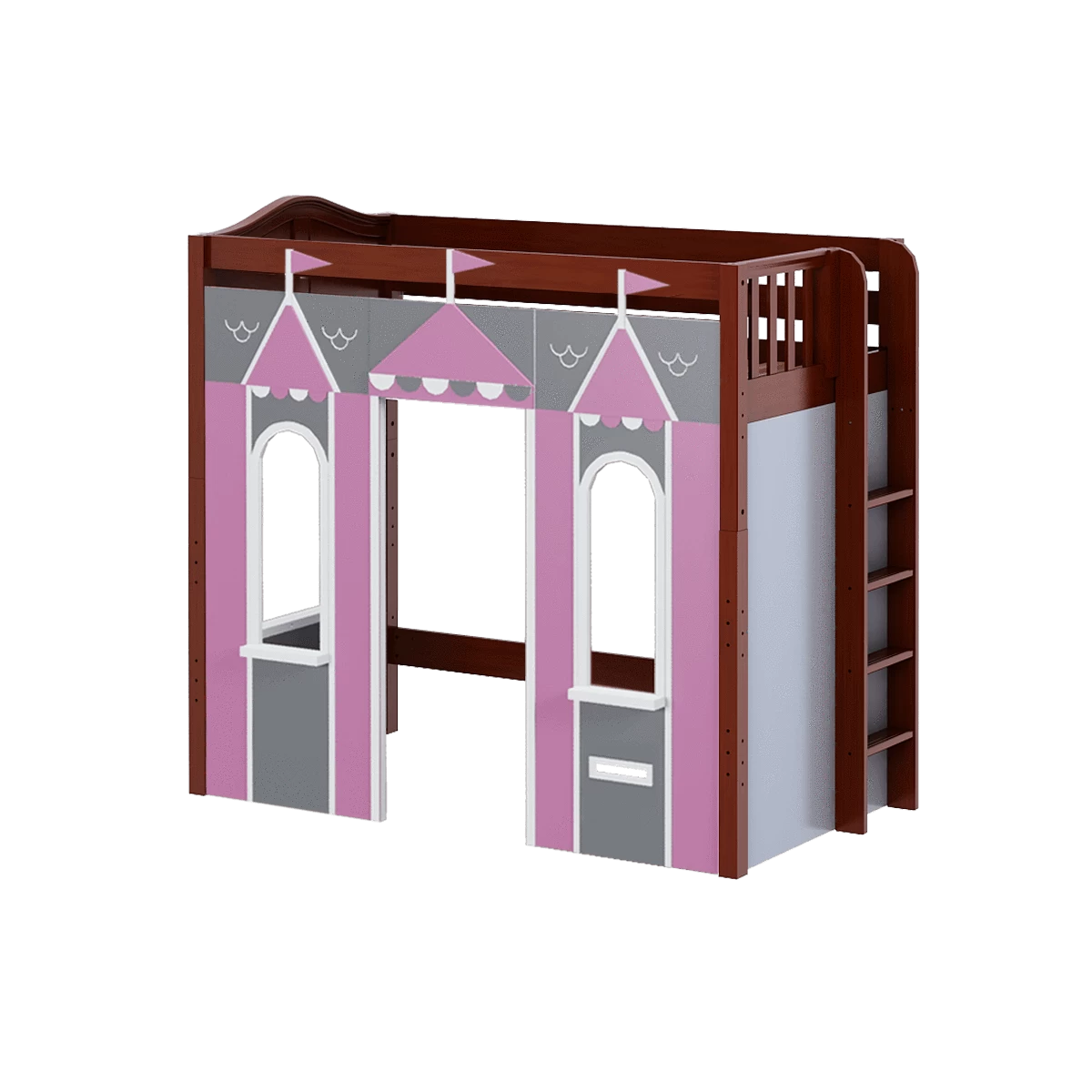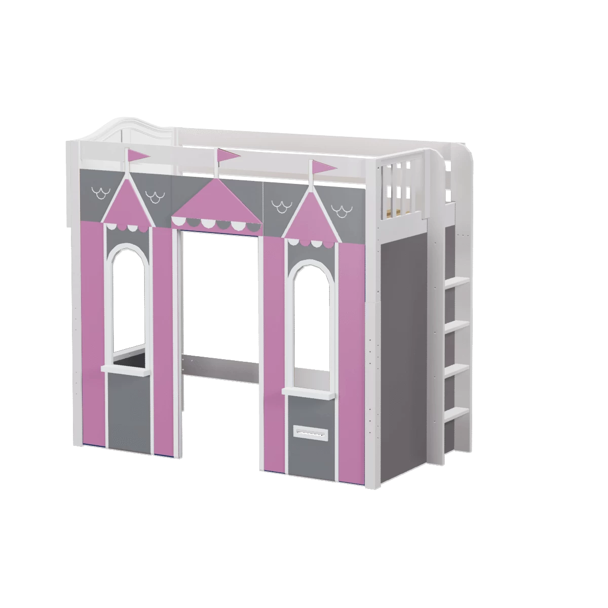 We created the ultimate indoor castle by adding colorful play panels to our best-selling high loft! Over 4 ft of underbed clearance is perfect for play today, and great for storage or study tomorrow as kids get older. Straight ladder sits flush against bed, saving floorspace.