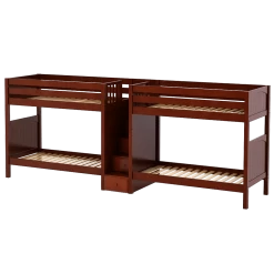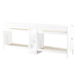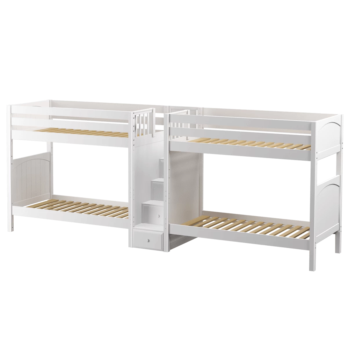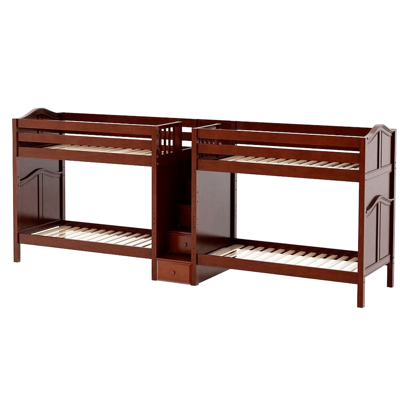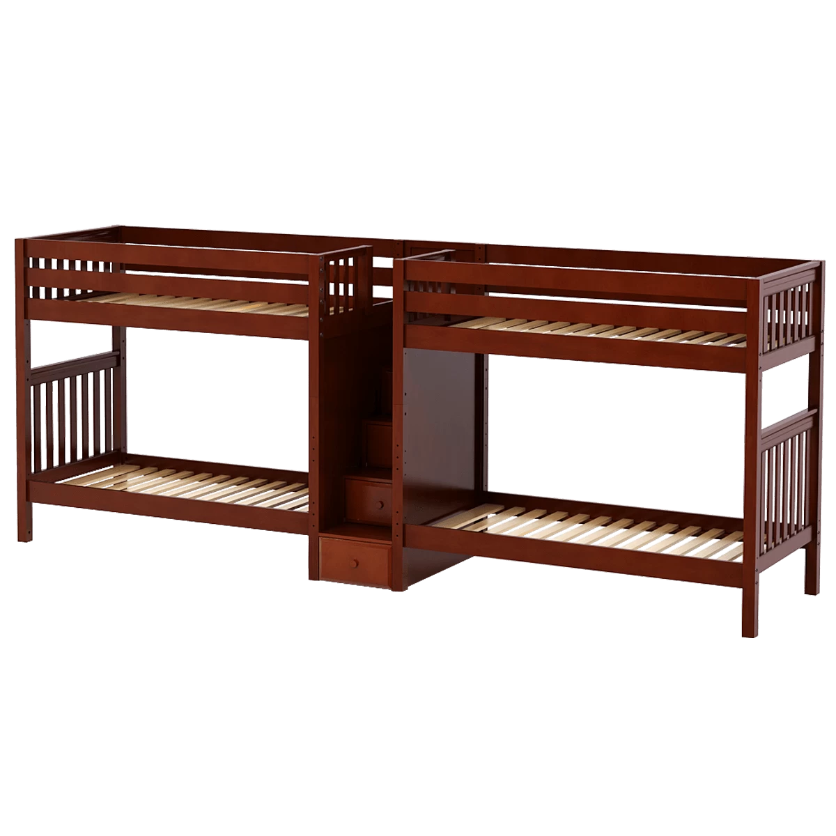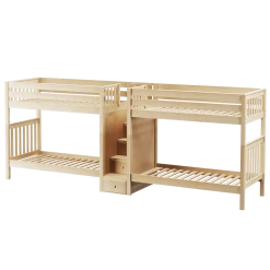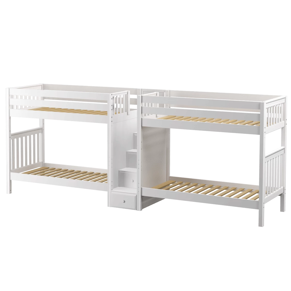 This Quadruple Bunk is two of our Twin High Bunk Beds connected by a staircase in the middle. Designed as a space-saving way to sleep four, it’s the perfect solution for a shared bedroom or vacation home. Added bonus, stairs double as drawers for built in storage!