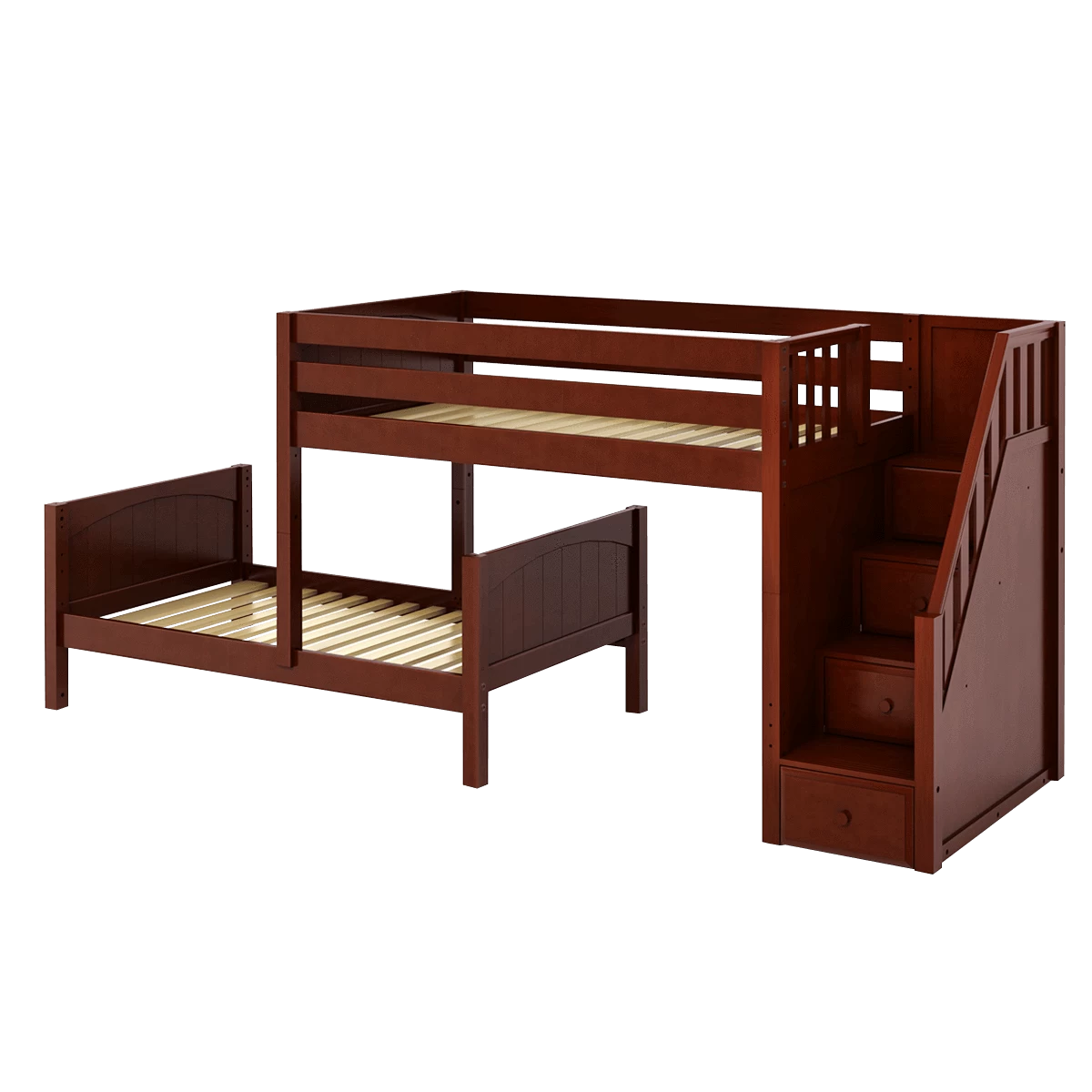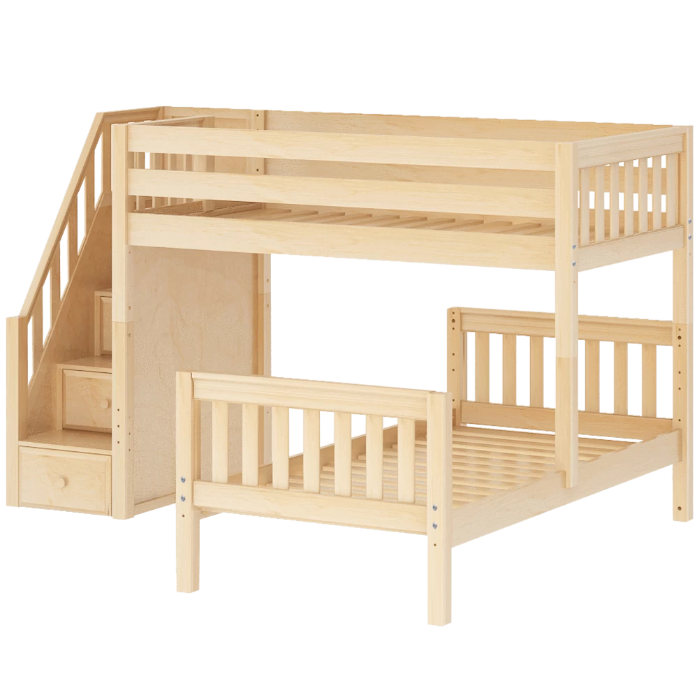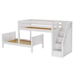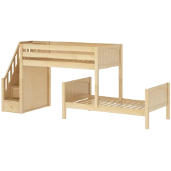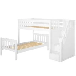 Kids are sure to love this super fun & functional design! Our Twin size L-shaped Bunk Bed can be assembled parallel or perpendicular. Stairs are a safe way for young children to climb into bed + plenty sturdy enough for adults. Added bonus – steps double as storage drawers, great for clothes or toys.Â