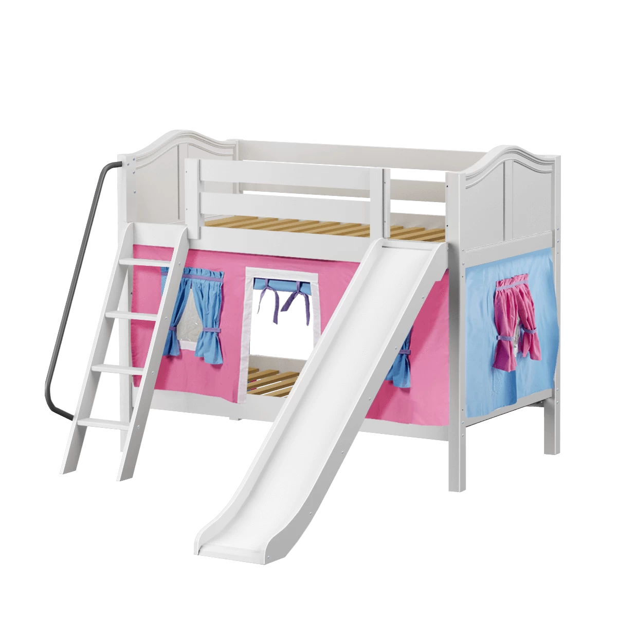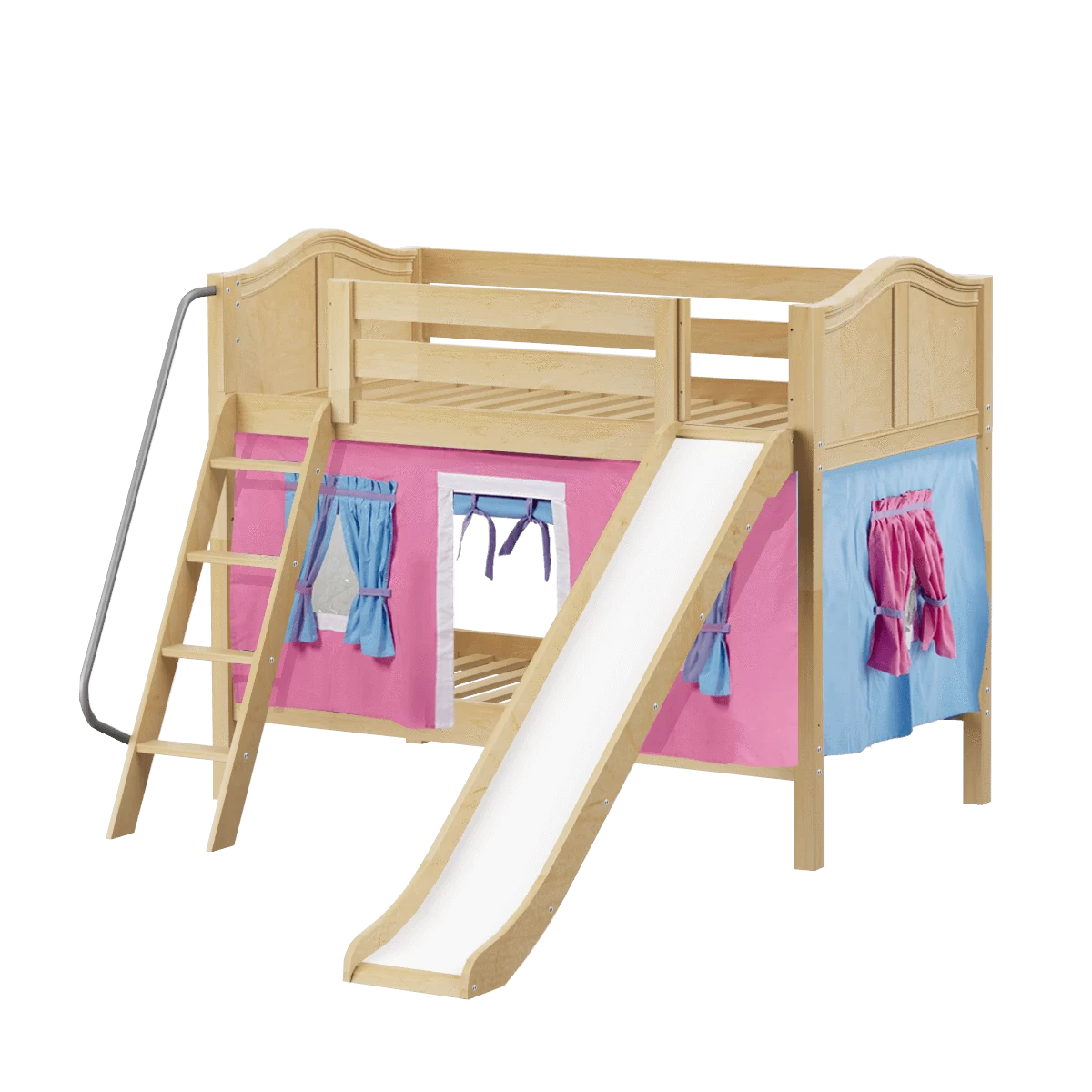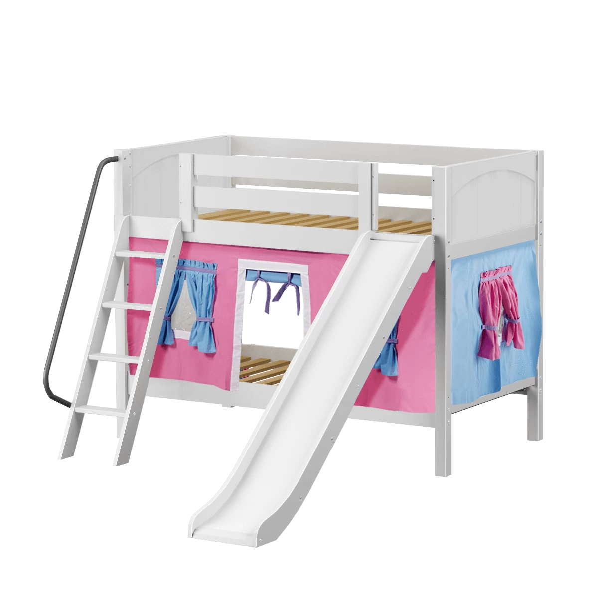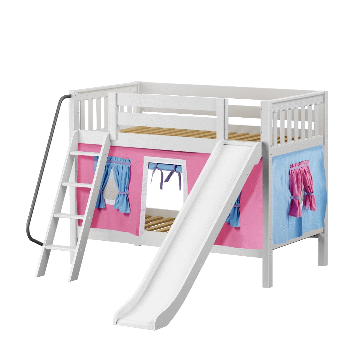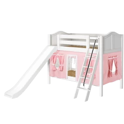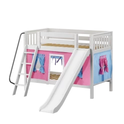 We added colorful curtains + slide to our classic low bunk, creating an adorable playhouse bed. Stacked design sleeps two comfortably – low height is perfect for small rooms and little ones. Angled ladder with sturdy handrail sticks out from bed at a slant for easy, comfortable climbing.