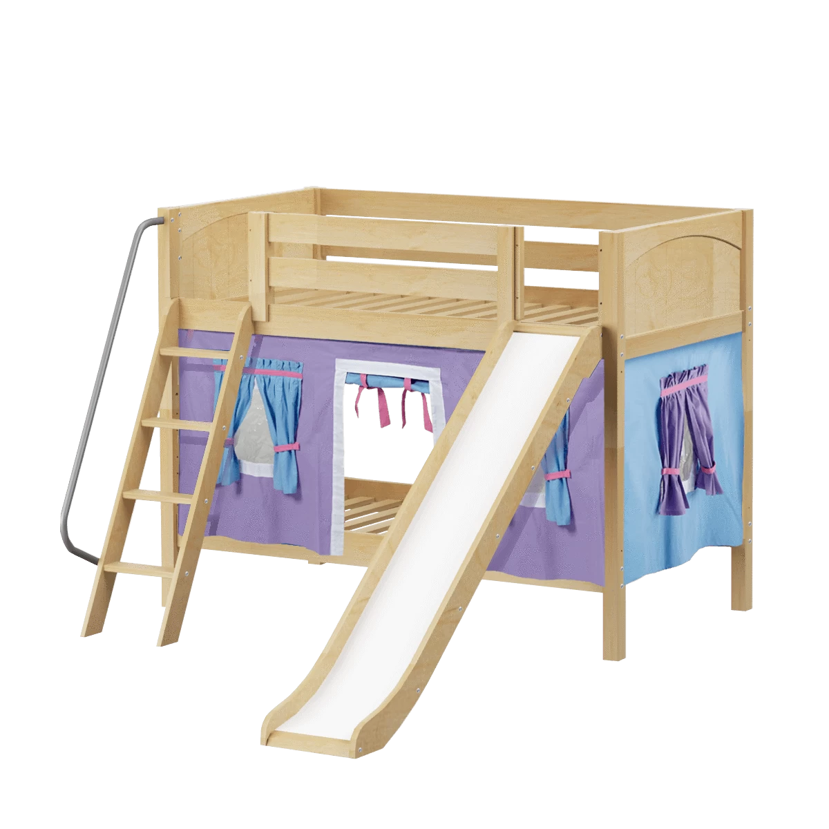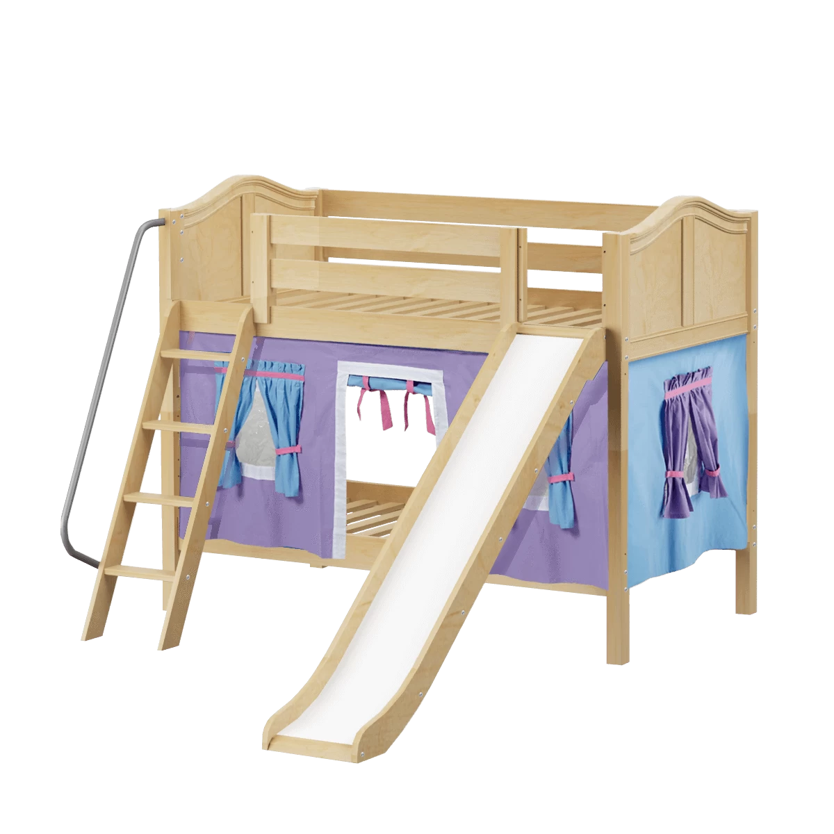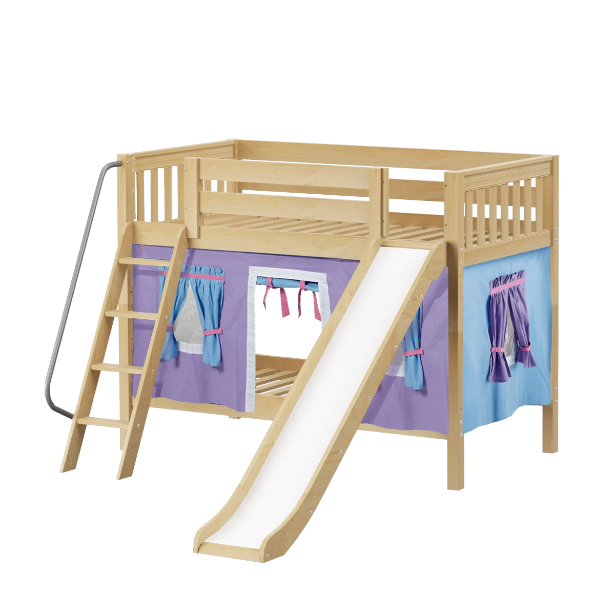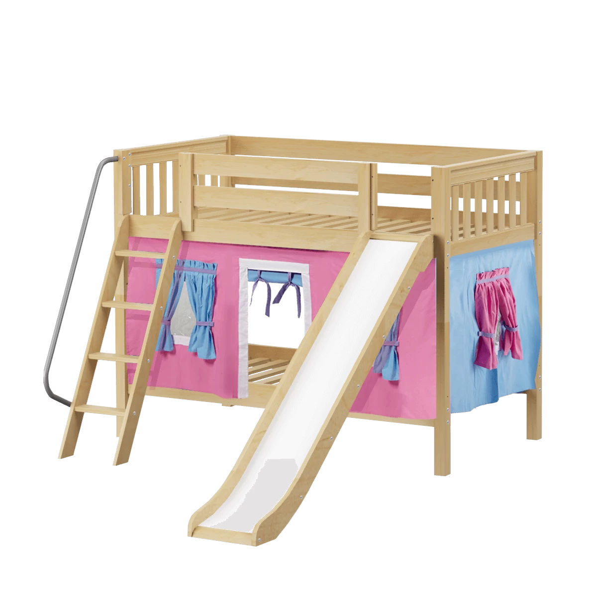 We added colorful curtains + slide to our classic low bunk, creating an adorable playhouse bed. Stacked design sleeps two comfortably – low height is perfect for small rooms and little ones. Angled ladder with sturdy handrail sticks out from bed at a slant for easy, comfortable climbing.