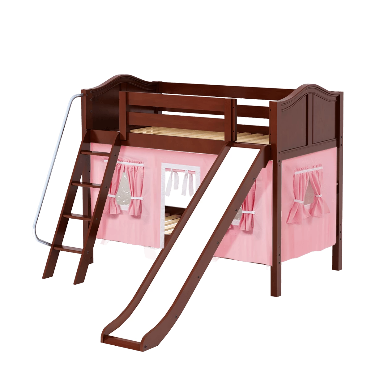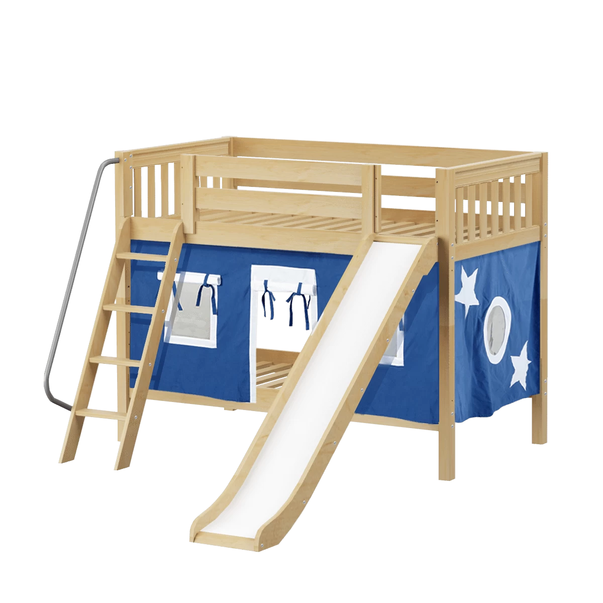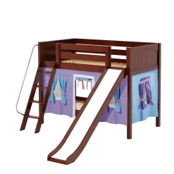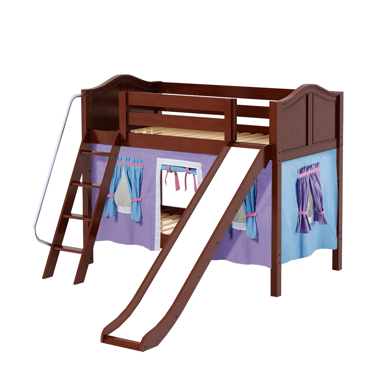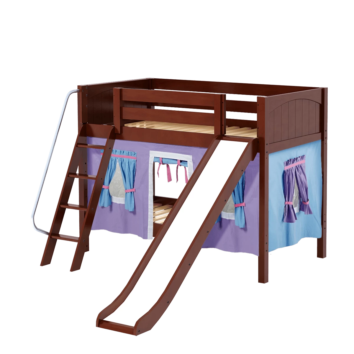 We added colorful curtains + slide to our classic low bunk, creating an adorable playhouse bed. Stacked design sleeps two comfortably – low height is perfect for small rooms and little ones. Angled ladder with sturdy handrail sticks out from bed at a slant for easy, comfortable climbing.