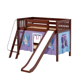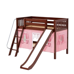 Climb up solid wood angled ladder with sturdy handrail, then take the slide back down. Only 61.5” tall, low height bunk beds are great for rooms with low ceilings (8 ft and lower) and little kids.