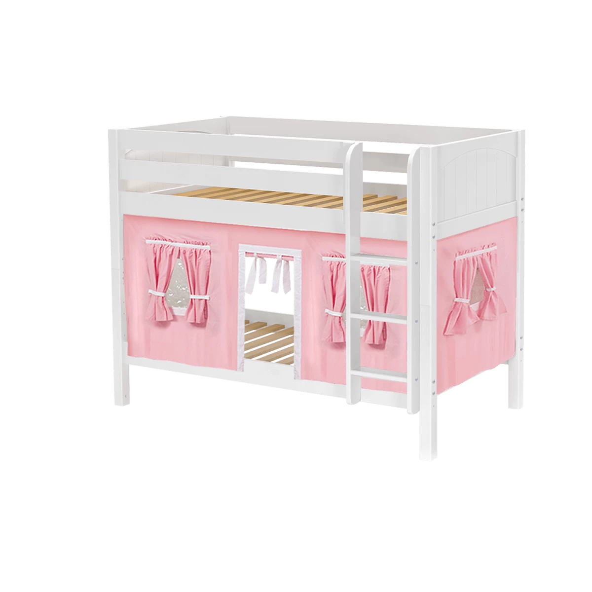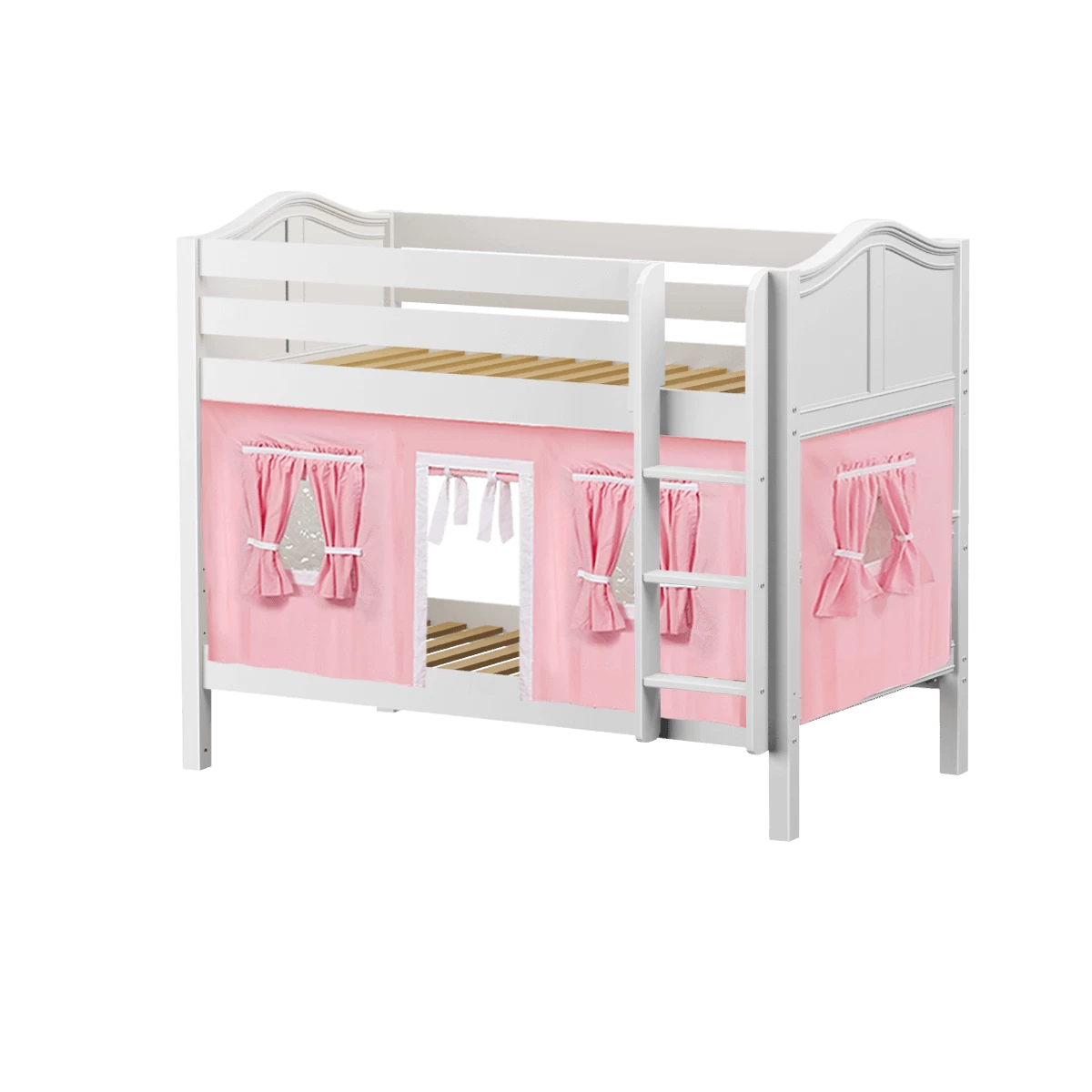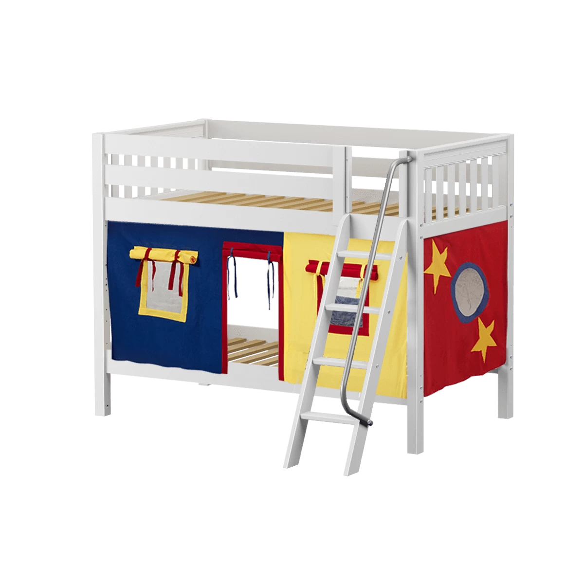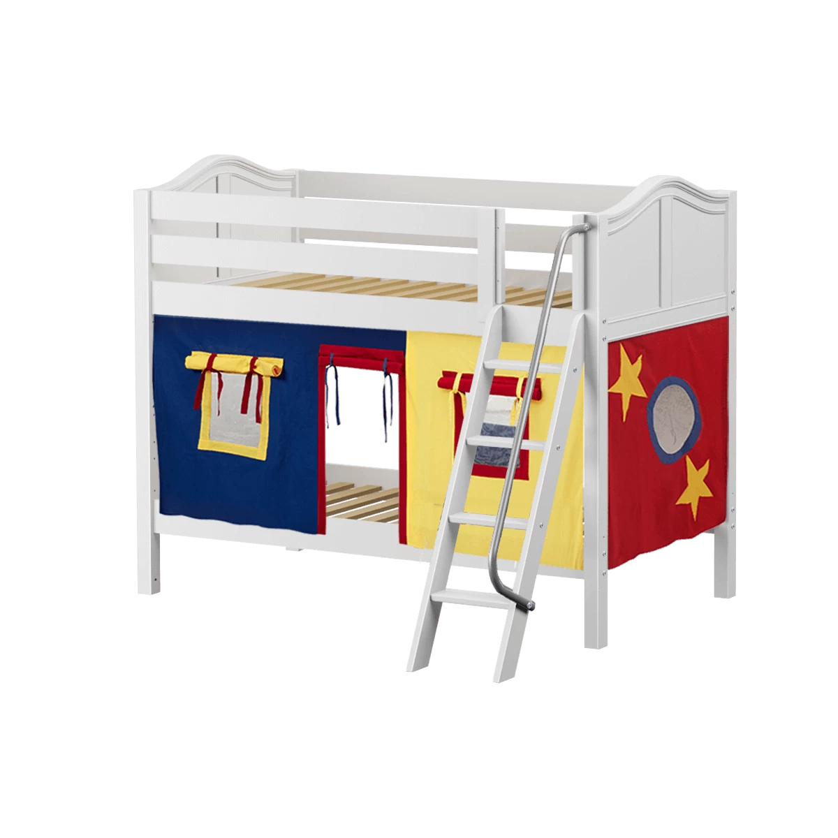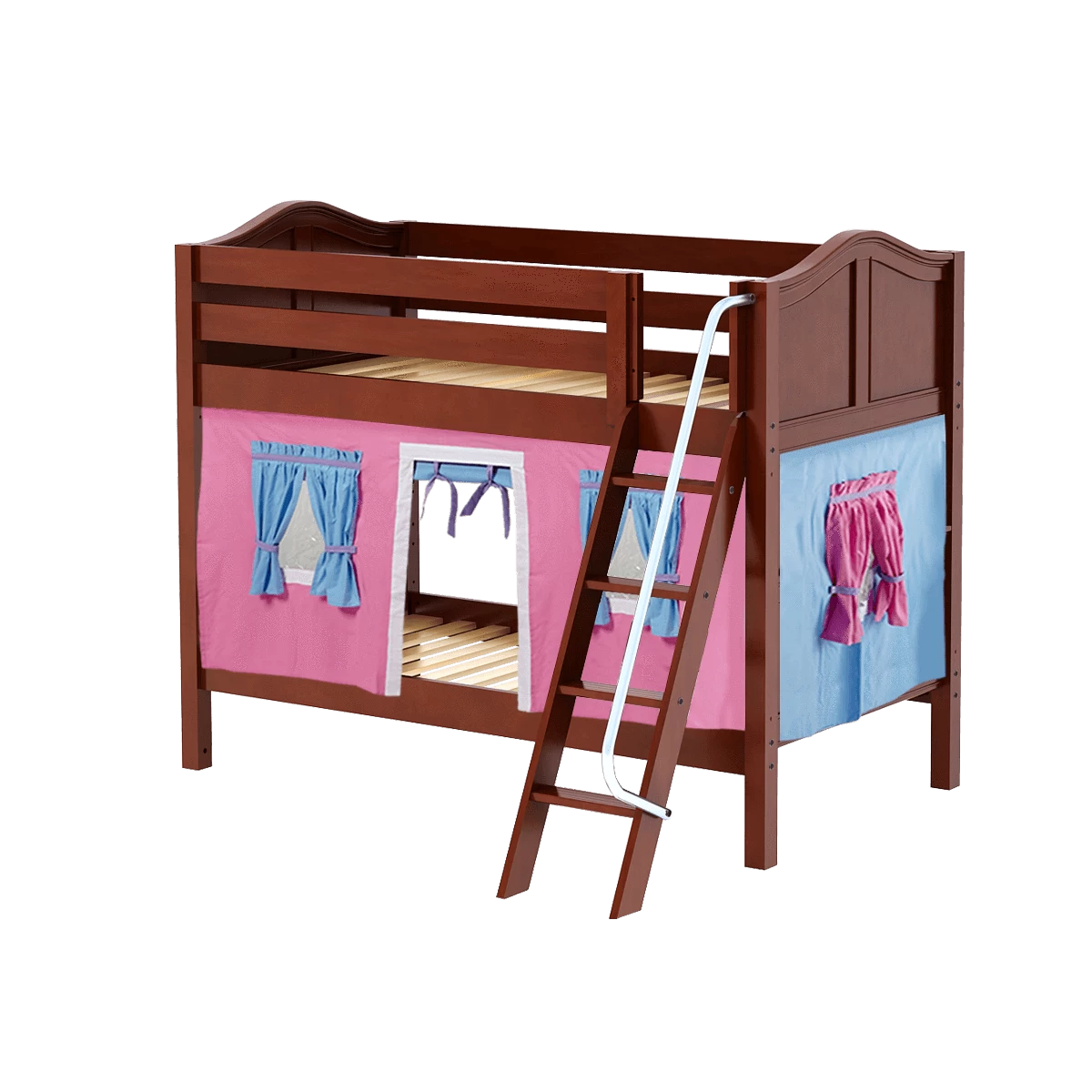 We added colorful fabric curtains to our classic low bunk to create an adorable playhouse bed. Angled ladder + sturdy handrail sticks out from bed at a slant for easy, comfortable climbing. Stacked design is a space-saving way to sleep two in one bedroom.