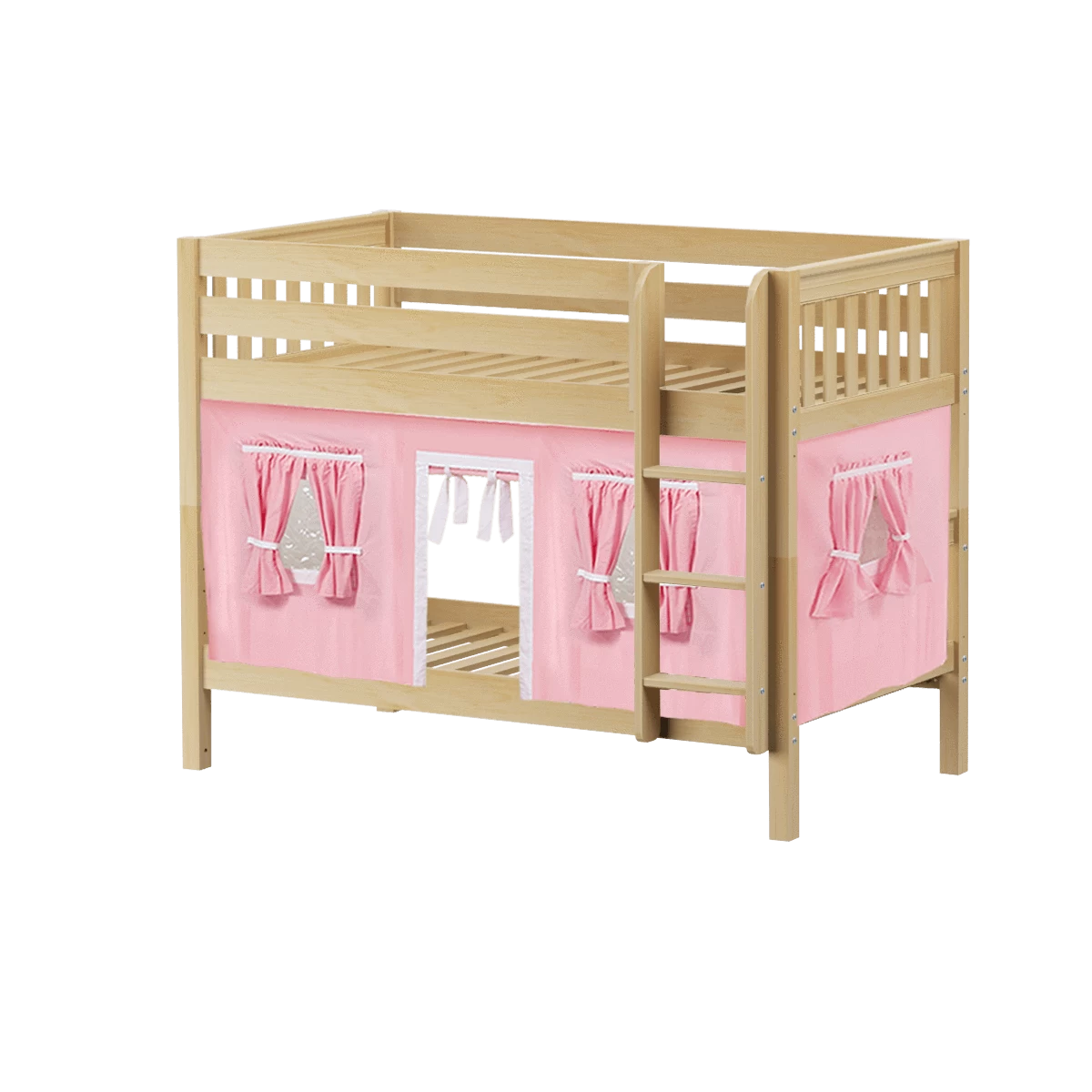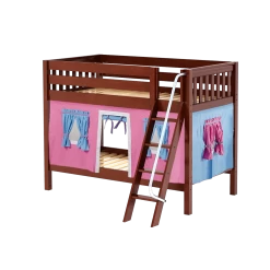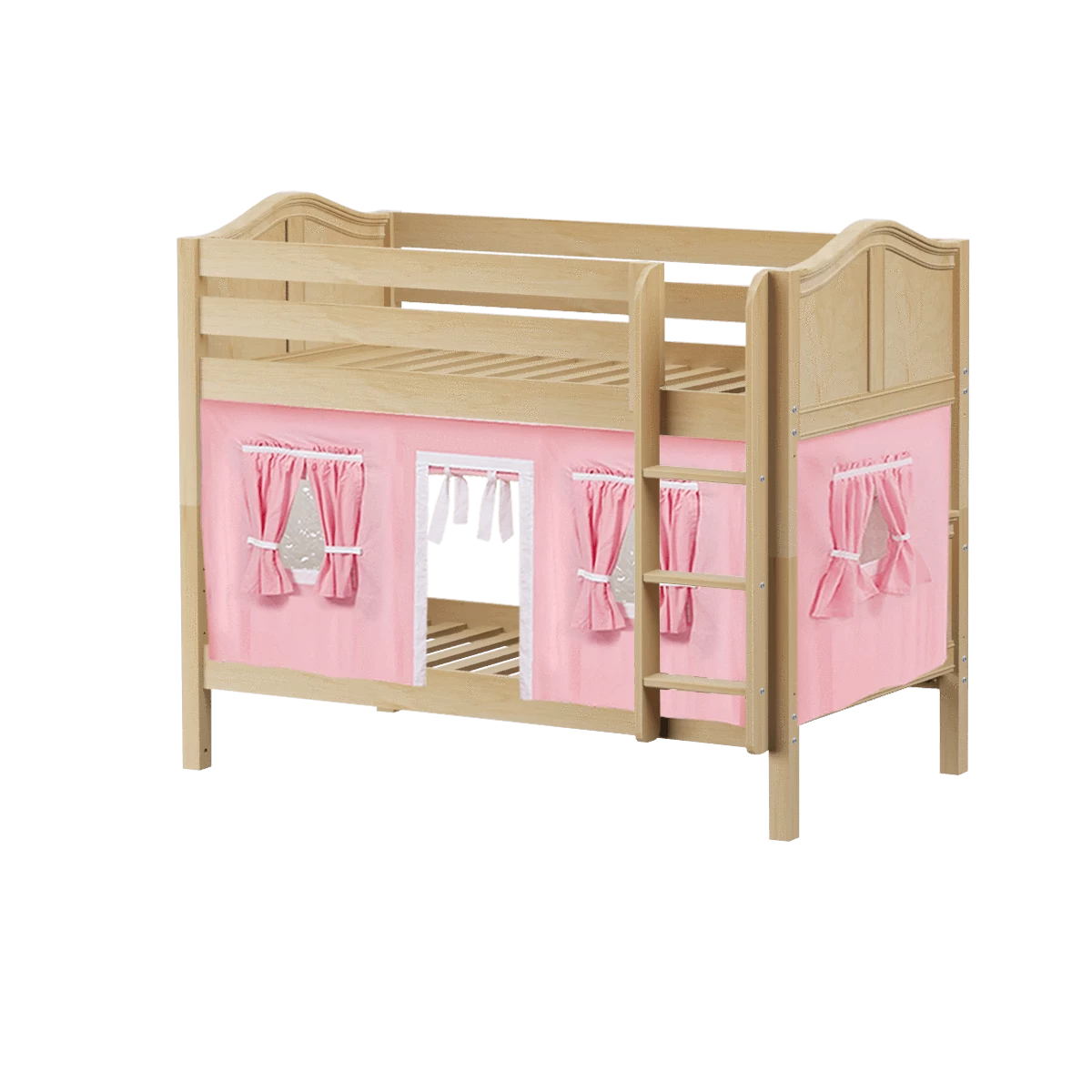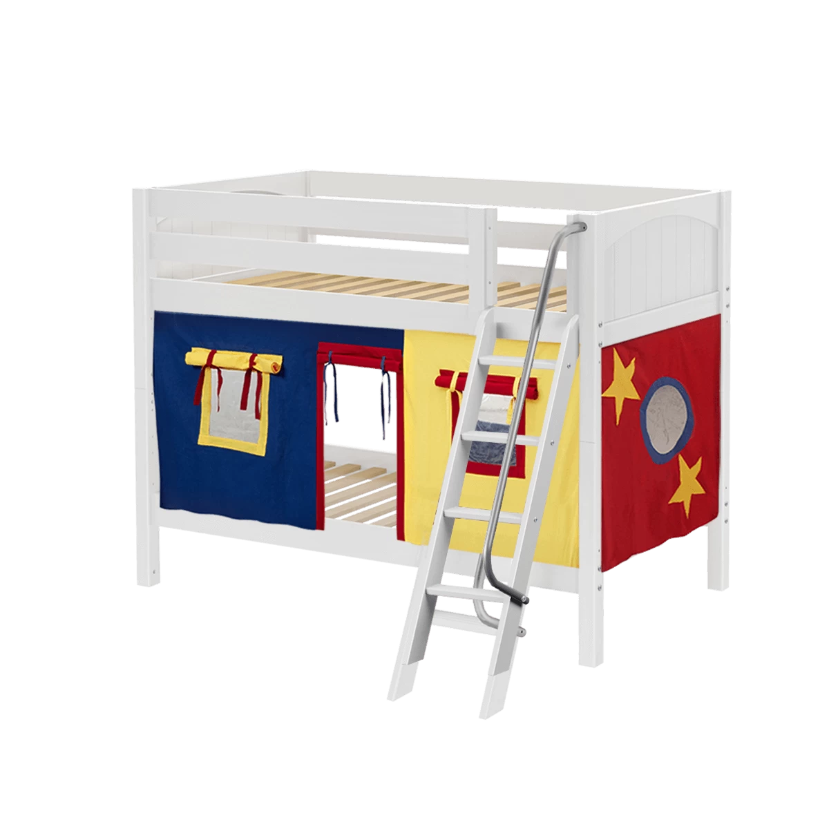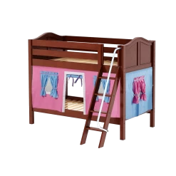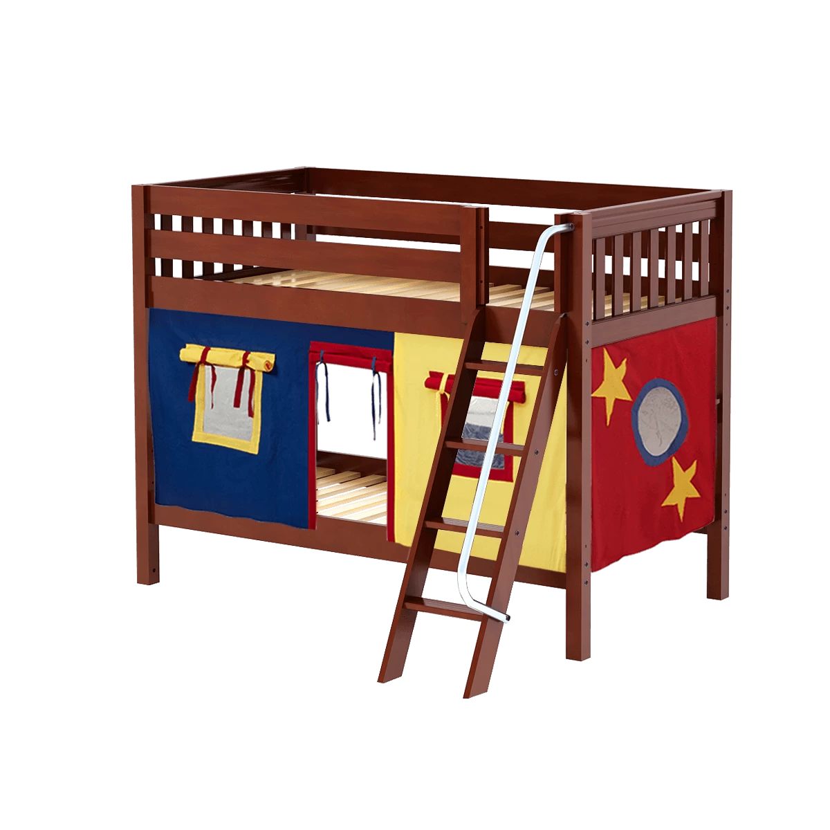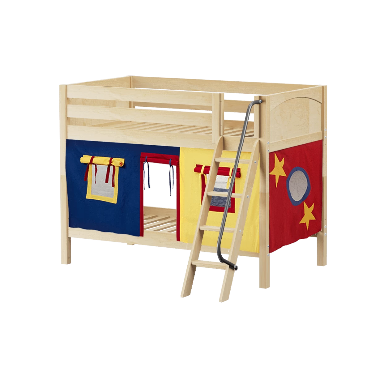 We added colorful fabric curtains to our classic low bunk to create an adorable playhouse bed. Angled ladder + sturdy handrail sticks out from bed at a slant for easy, comfortable climbing. Stacked design is a space-saving way to sleep two in one bedroom.