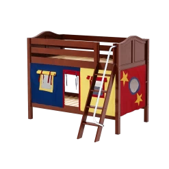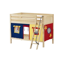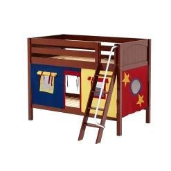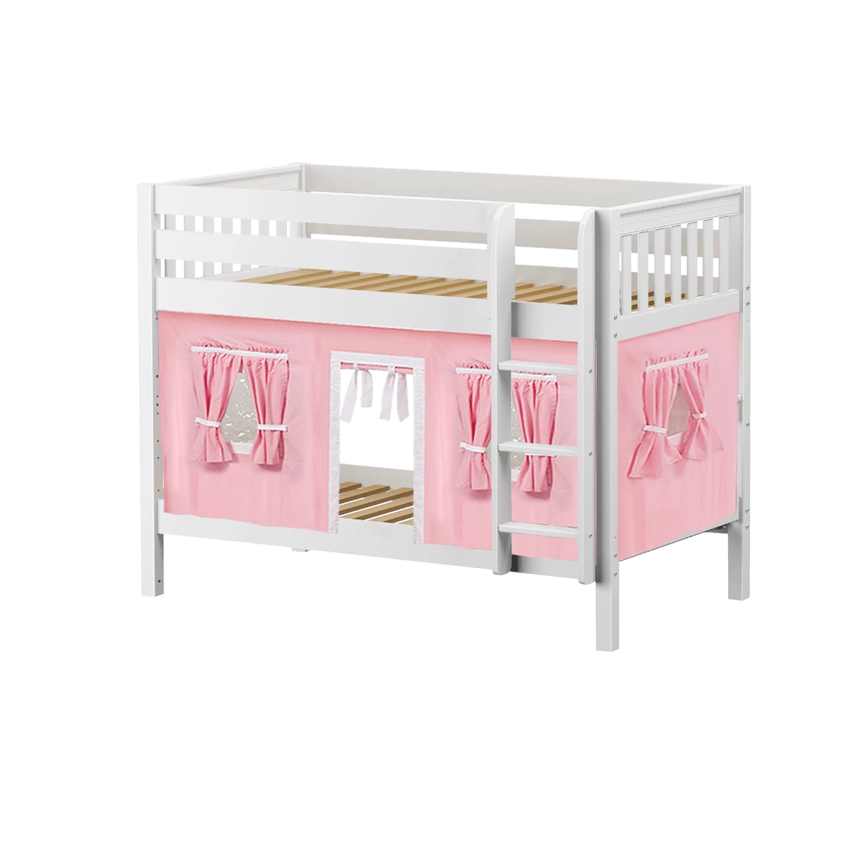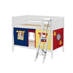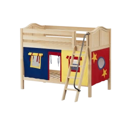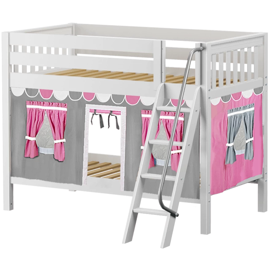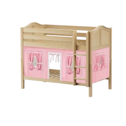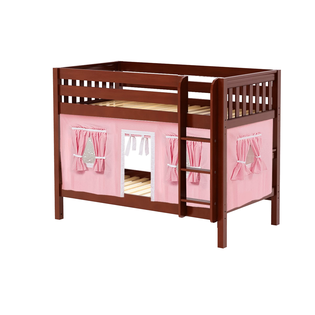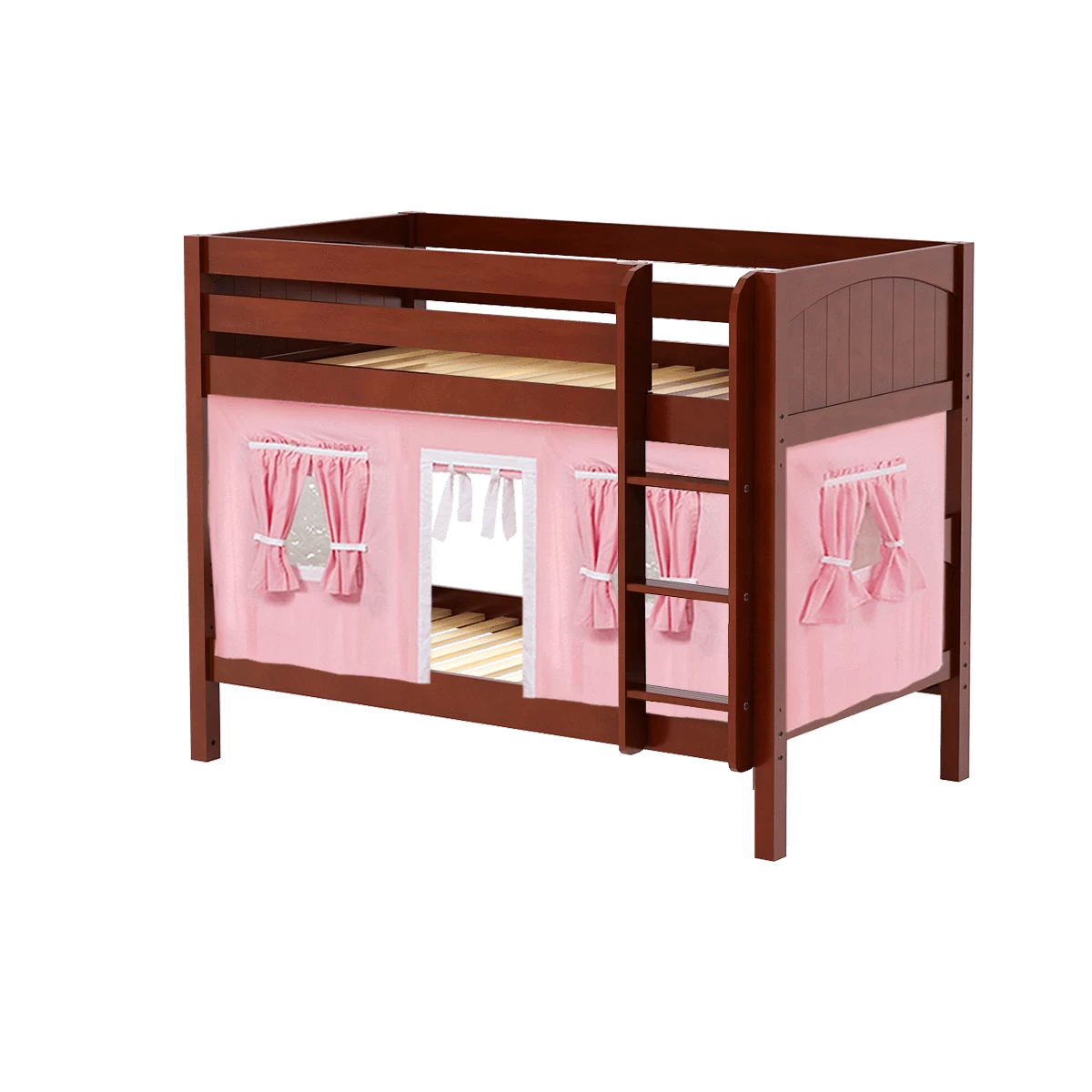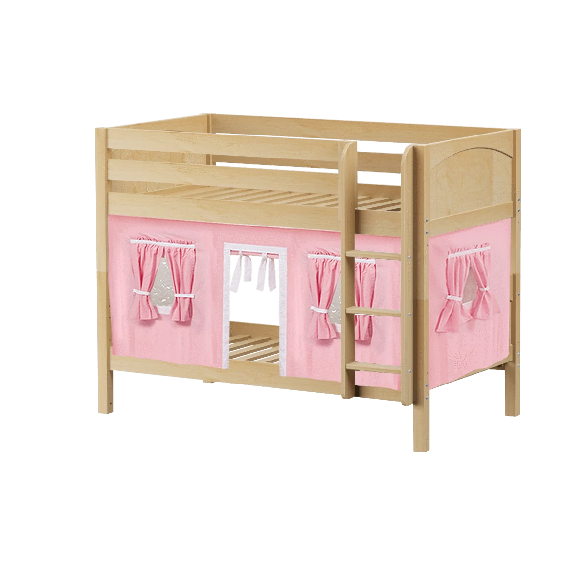 We added colorful fabric curtains to our classic low bunk to create an adorable playhouse bed. Angled ladder + sturdy handrail sticks out from bed at a slant for easy, comfortable climbing. Stacked design is a space-saving way to sleep two in one bedroom.