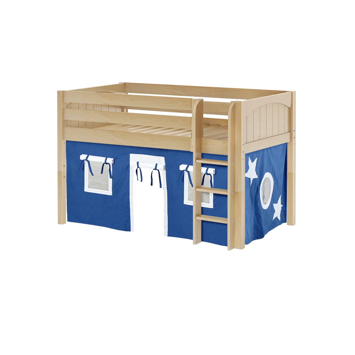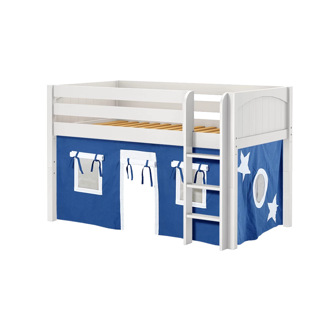 Climb up space-saving, solid wood straight ladder with extra wide, grooved steps. Only 50.75” high, this low loft bed is suitable for rooms with low ceilings (8 feet and lower) and smaller spaces.