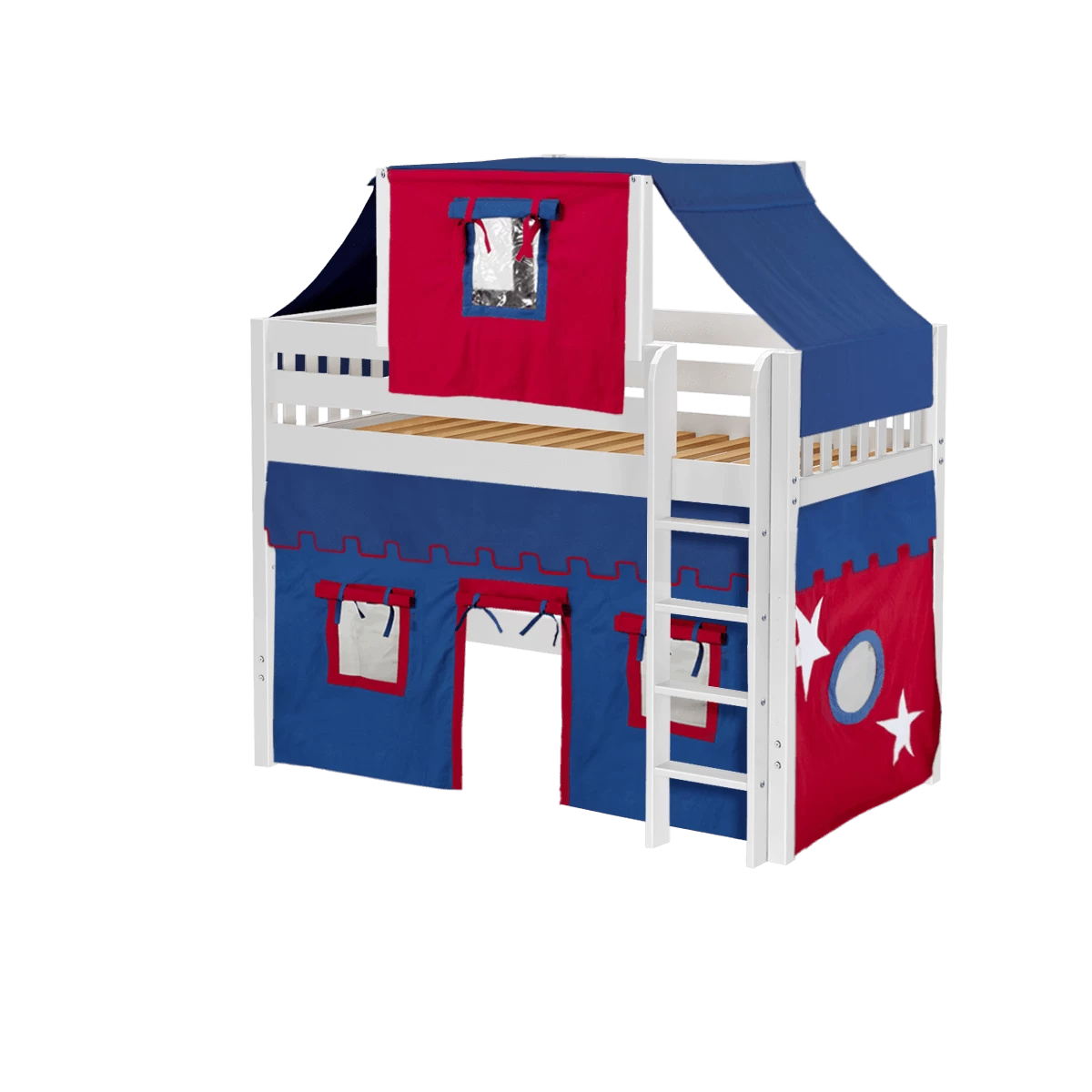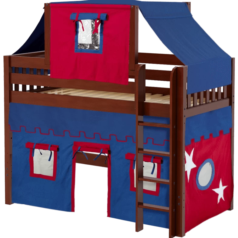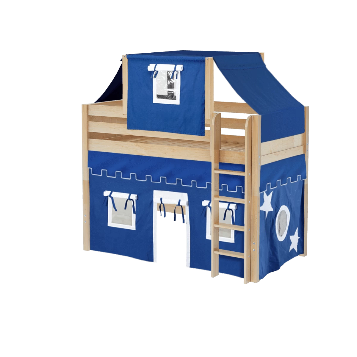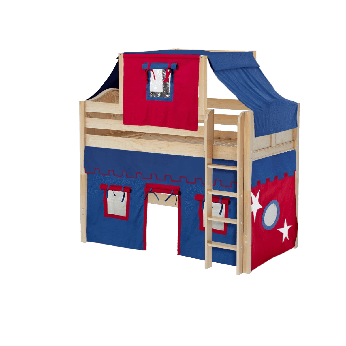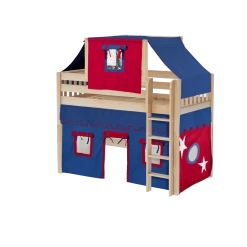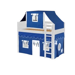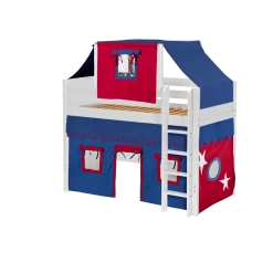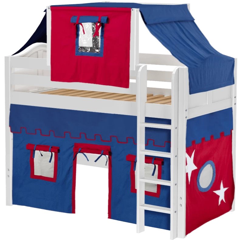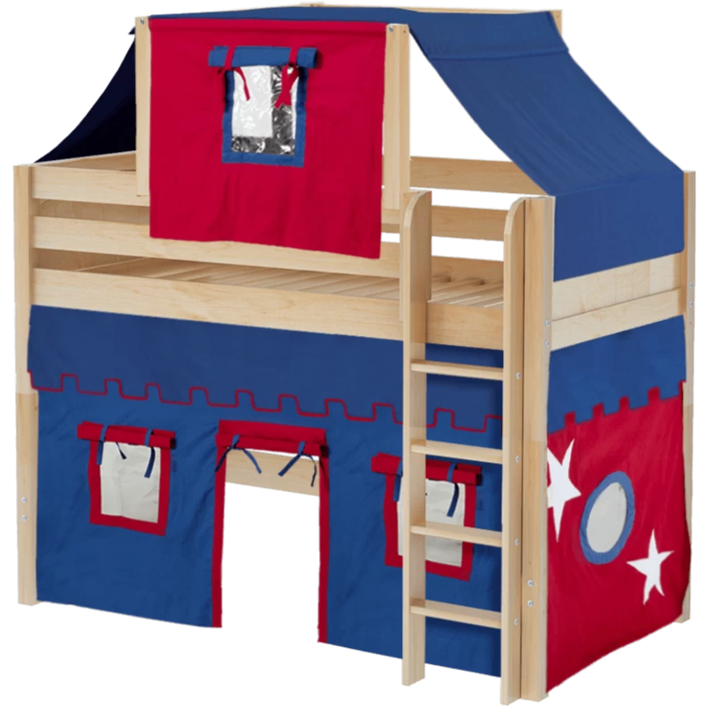 Our best-selling mid loft bed gets an extra dose of fun with the addition of colorful fabrics. Curtains + matching top tent will inspire your child’s imagination during the day and help them sleep soundly at night. Space saving straight ladder sits flush against the bed.
