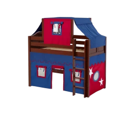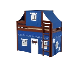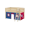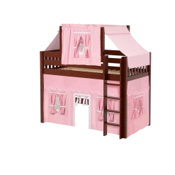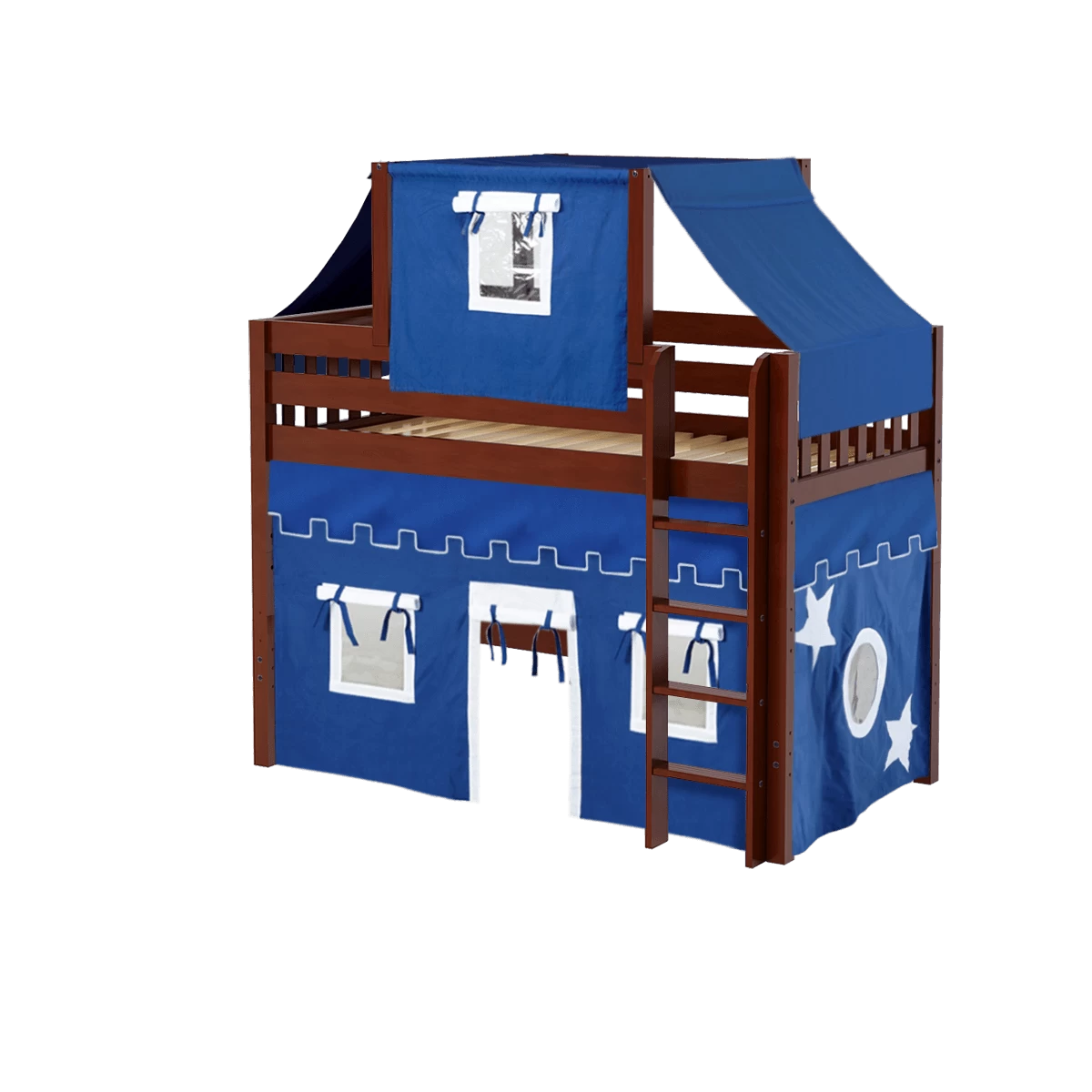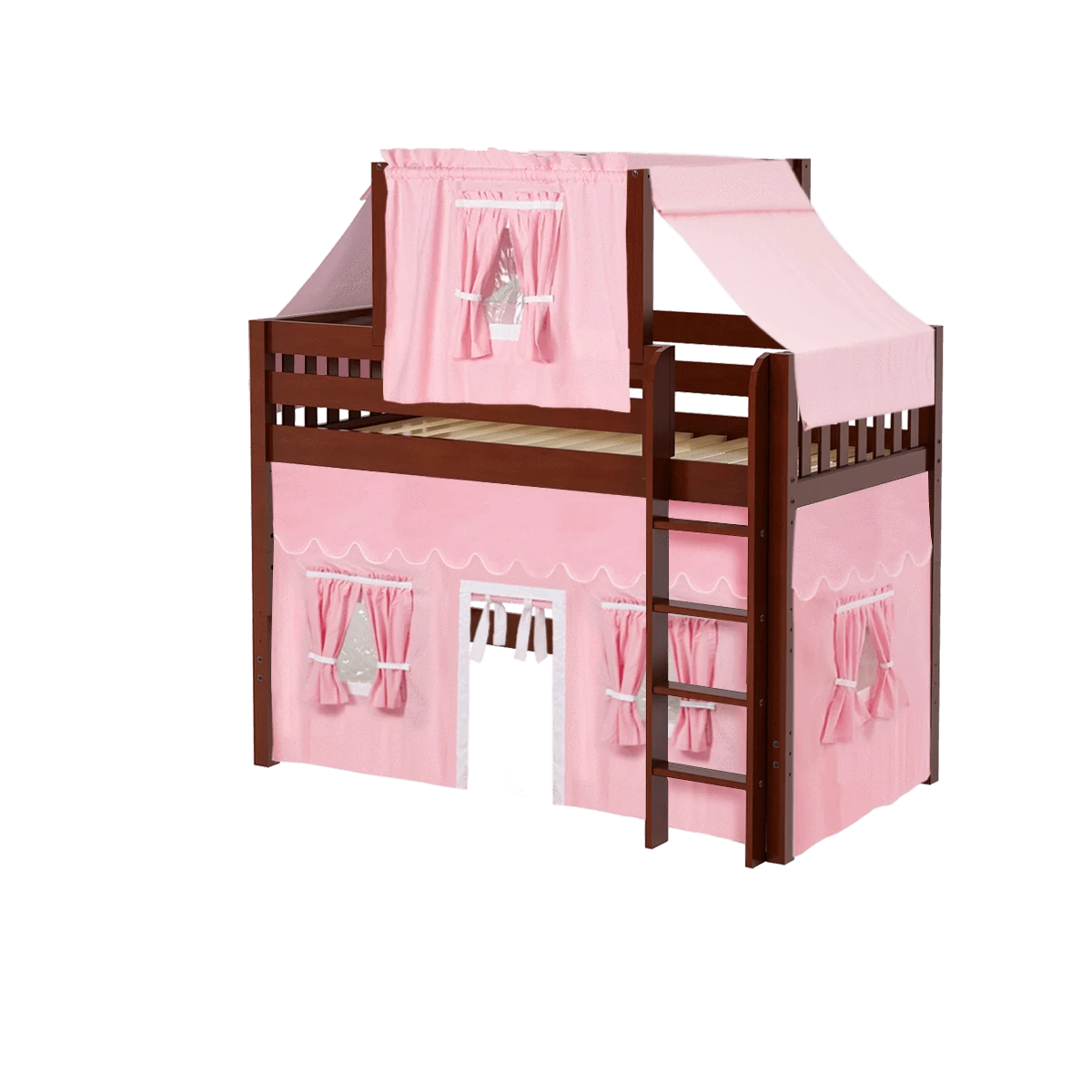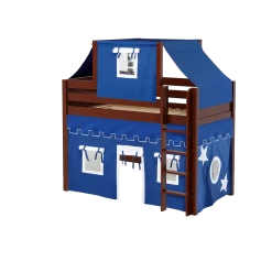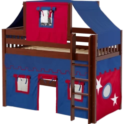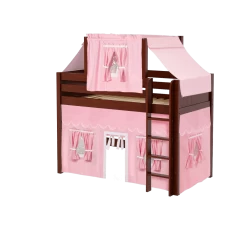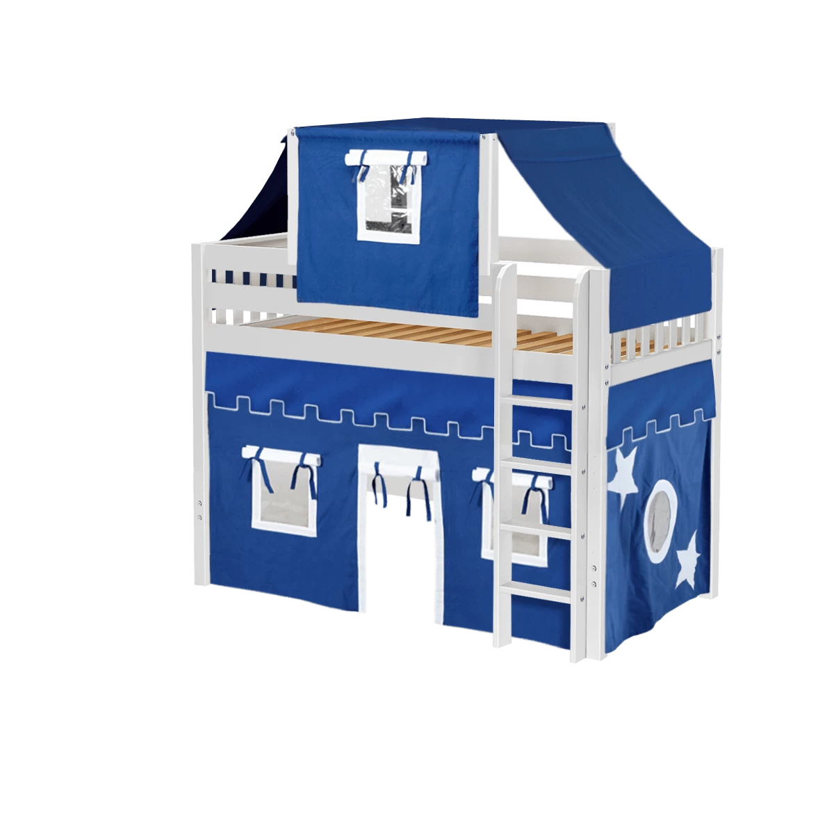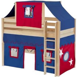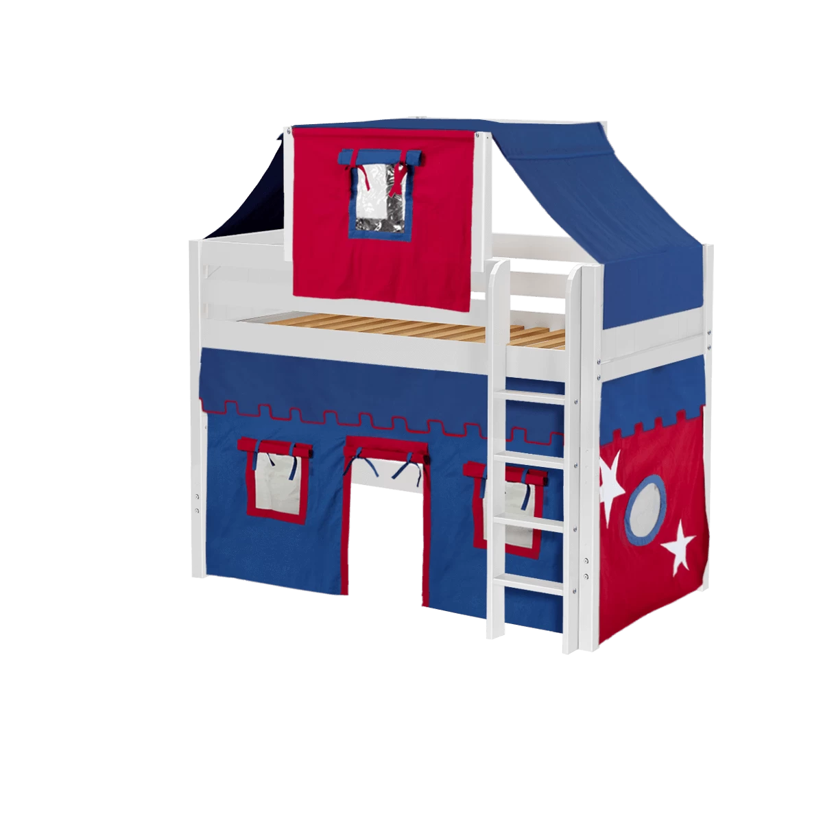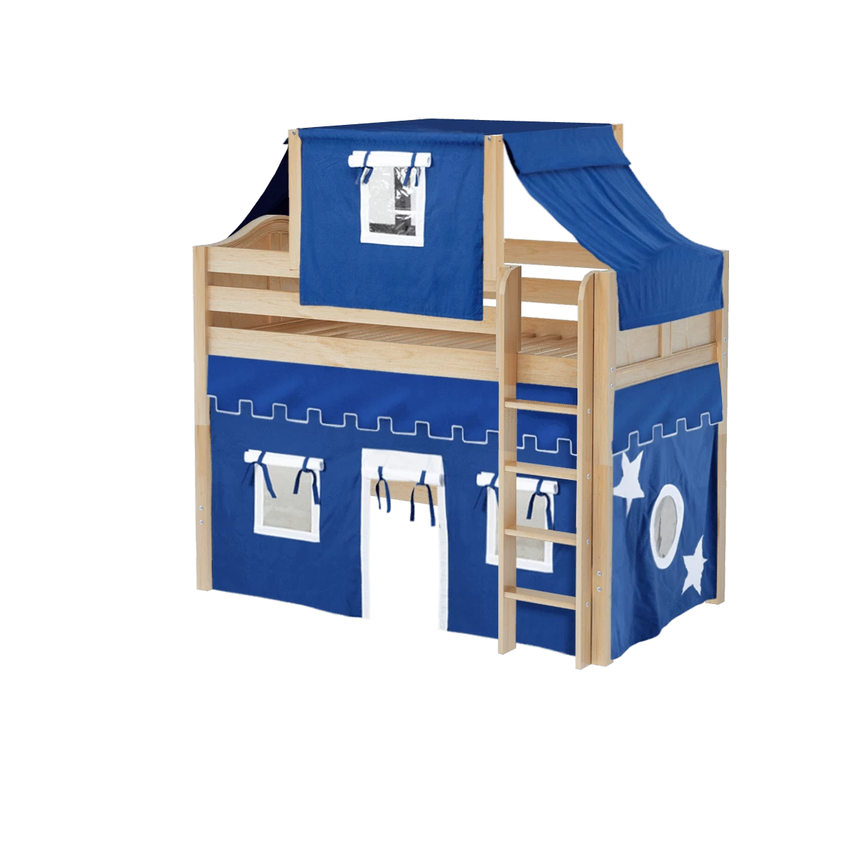 Our best-selling mid loft bed gets an extra dose of fun with the addition of colorful fabrics. Curtains + matching top tent will inspire your child’s imagination during the day and help them sleep soundly at night. Space saving straight ladder sits flush against the bed.