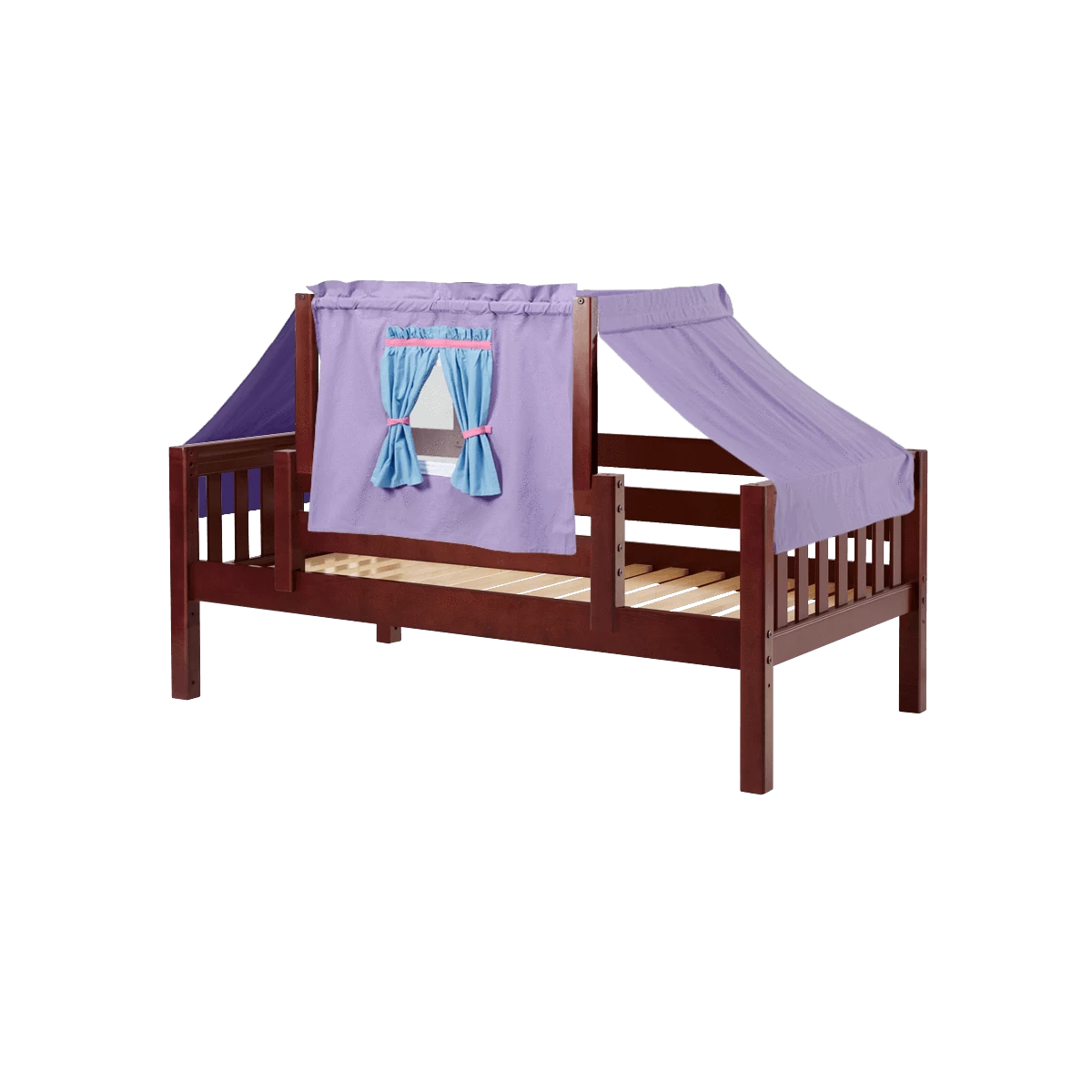 Transition your toddler out of the crib and into our adorable daybed with top tent. Front and back guardrails keep little ones super safe + secure. Colorful fabrics create a cozy space for both sleep and play. The perfect first bed, but easily converts as your child grows so you can use for years to come.
