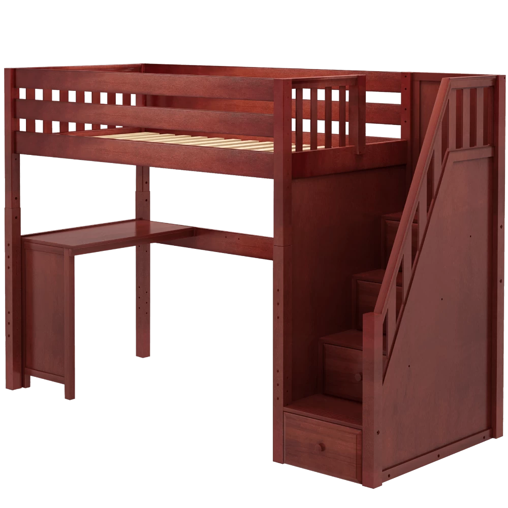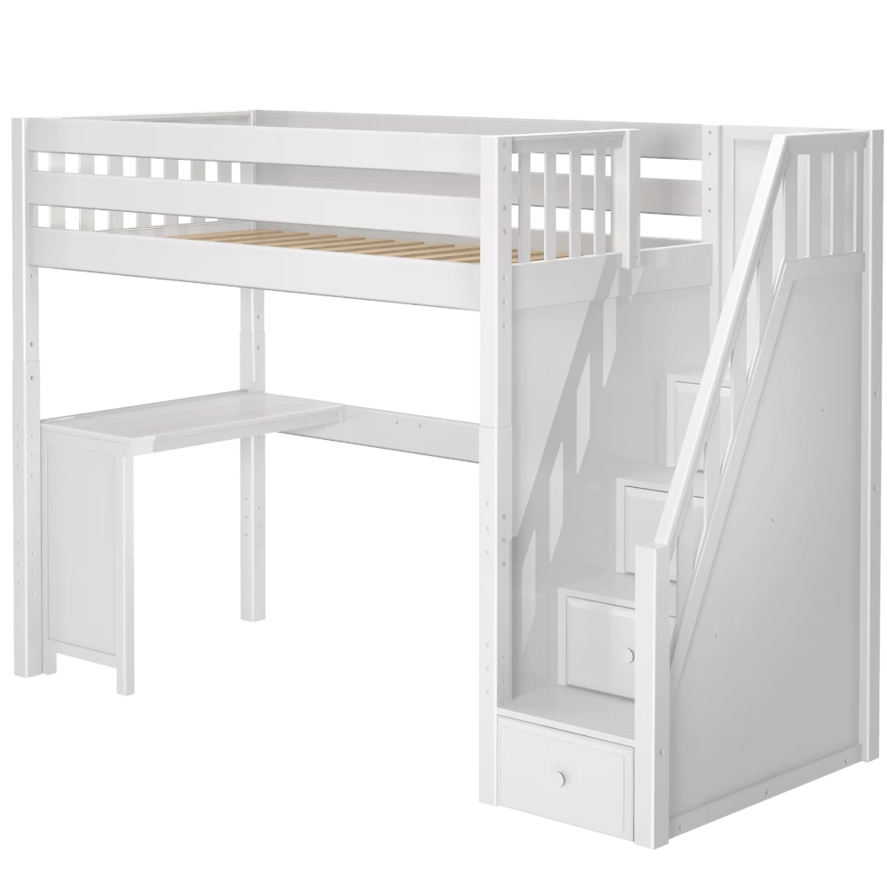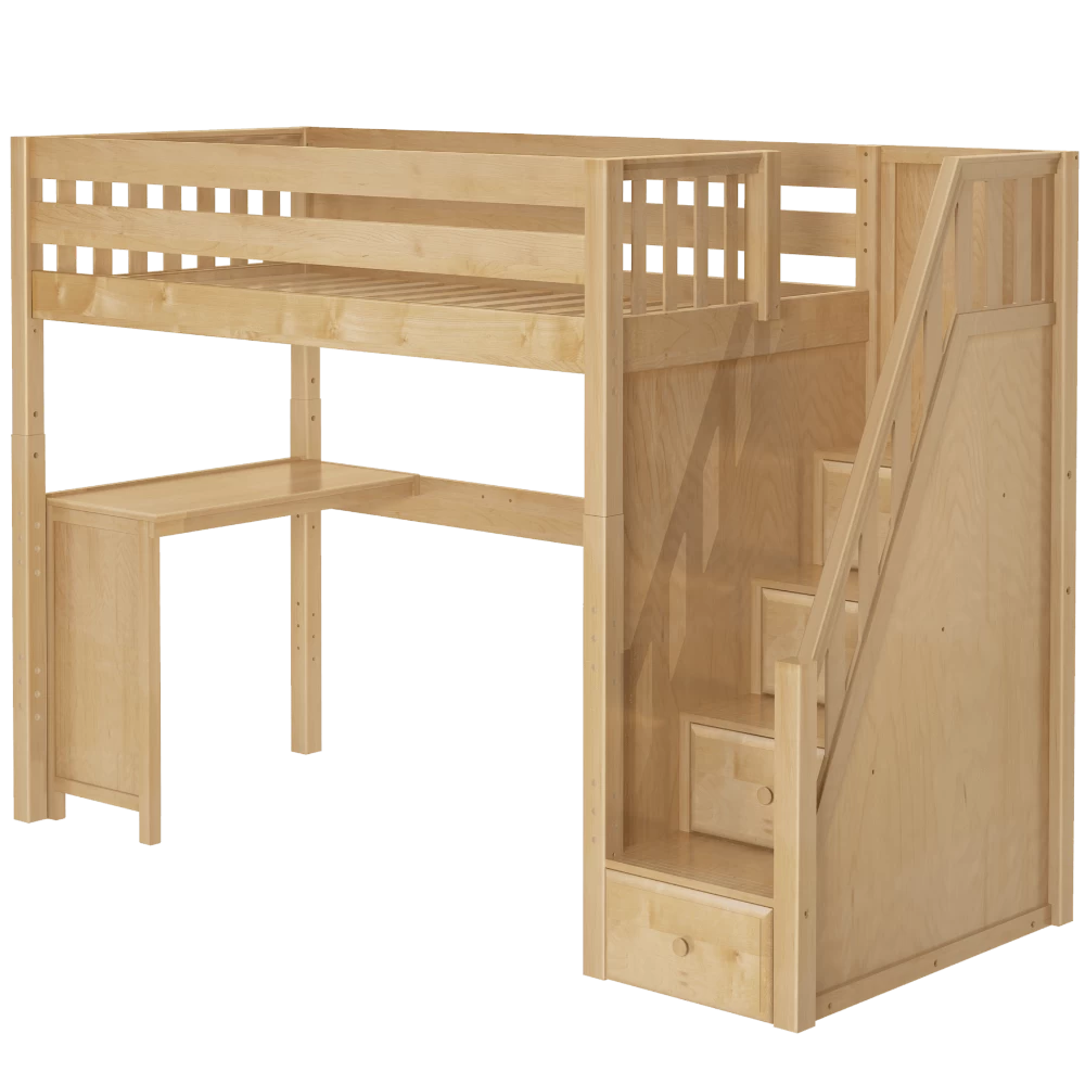 Our high loft with stairs becomes the ultimate sleep + study combo! Attached matching desk creates a functional spot for schoolwork and frees up valuable floorspace in the bedroom. Easy to climb staircase steps double as storage drawers. Now available in Twin XL size so there’s plenty of room to grow.