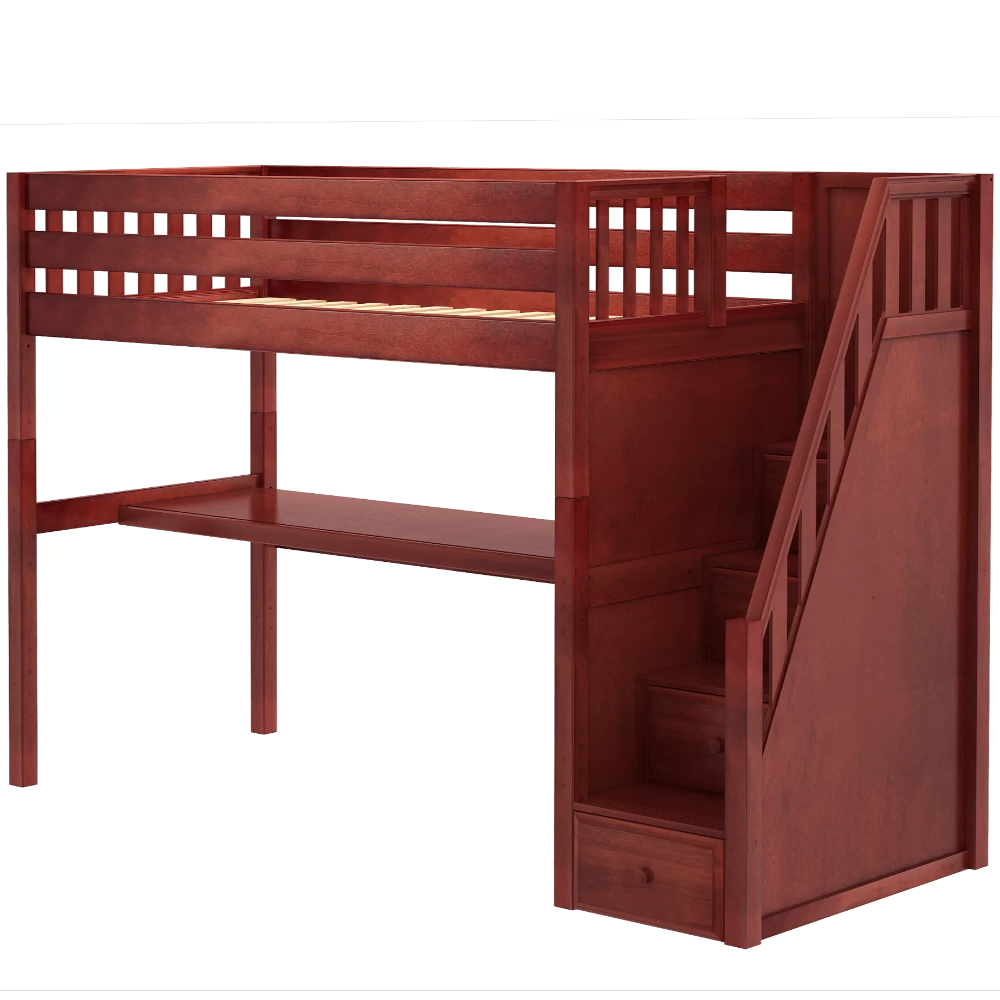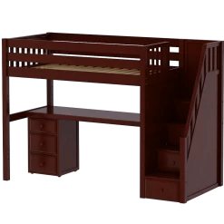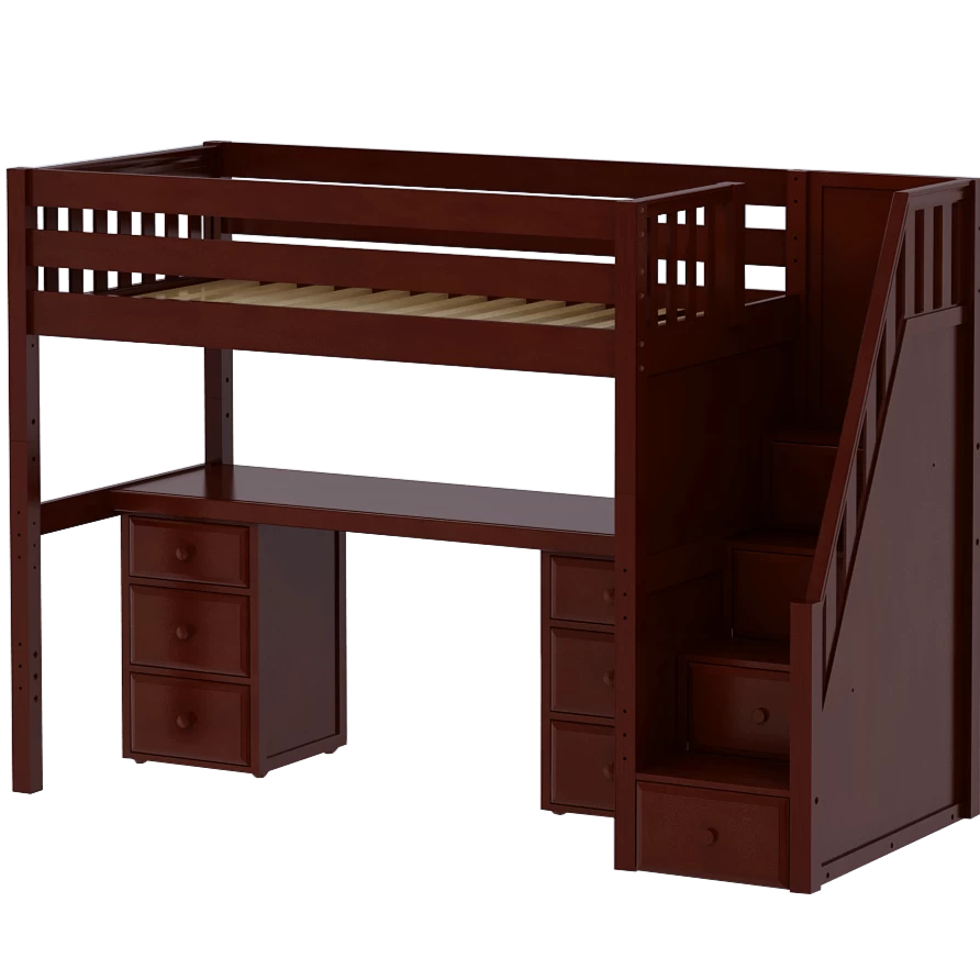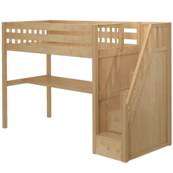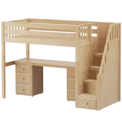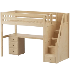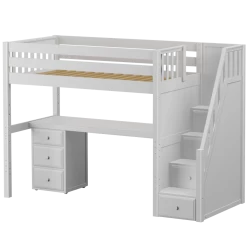 Our high loft with stairs becomes the ultimate sleep + study combo! Attached matching desk creates a functional spot for schoolwork and frees up valuable floorspace in the bedroom. Easy to climb staircase steps double as storage drawers. Now available in Twin XL size so there’s plenty of room to grow.