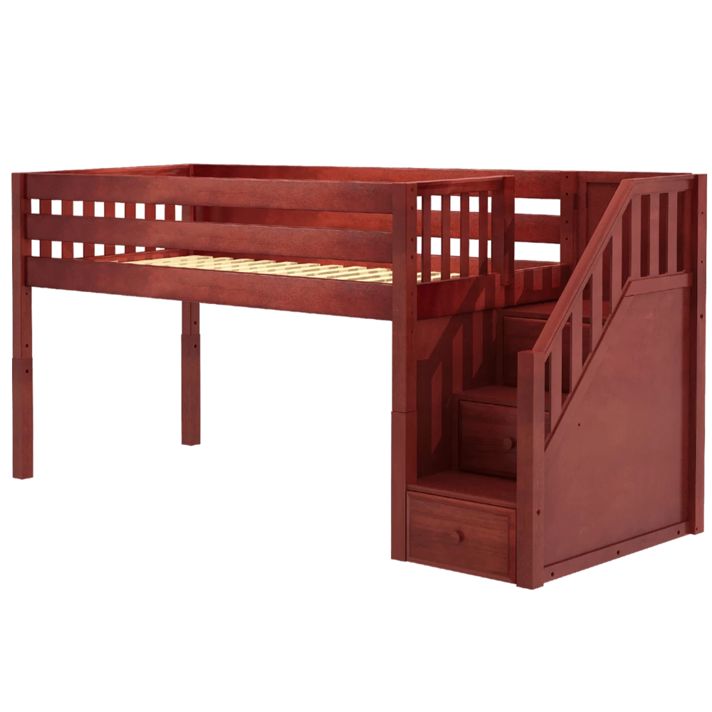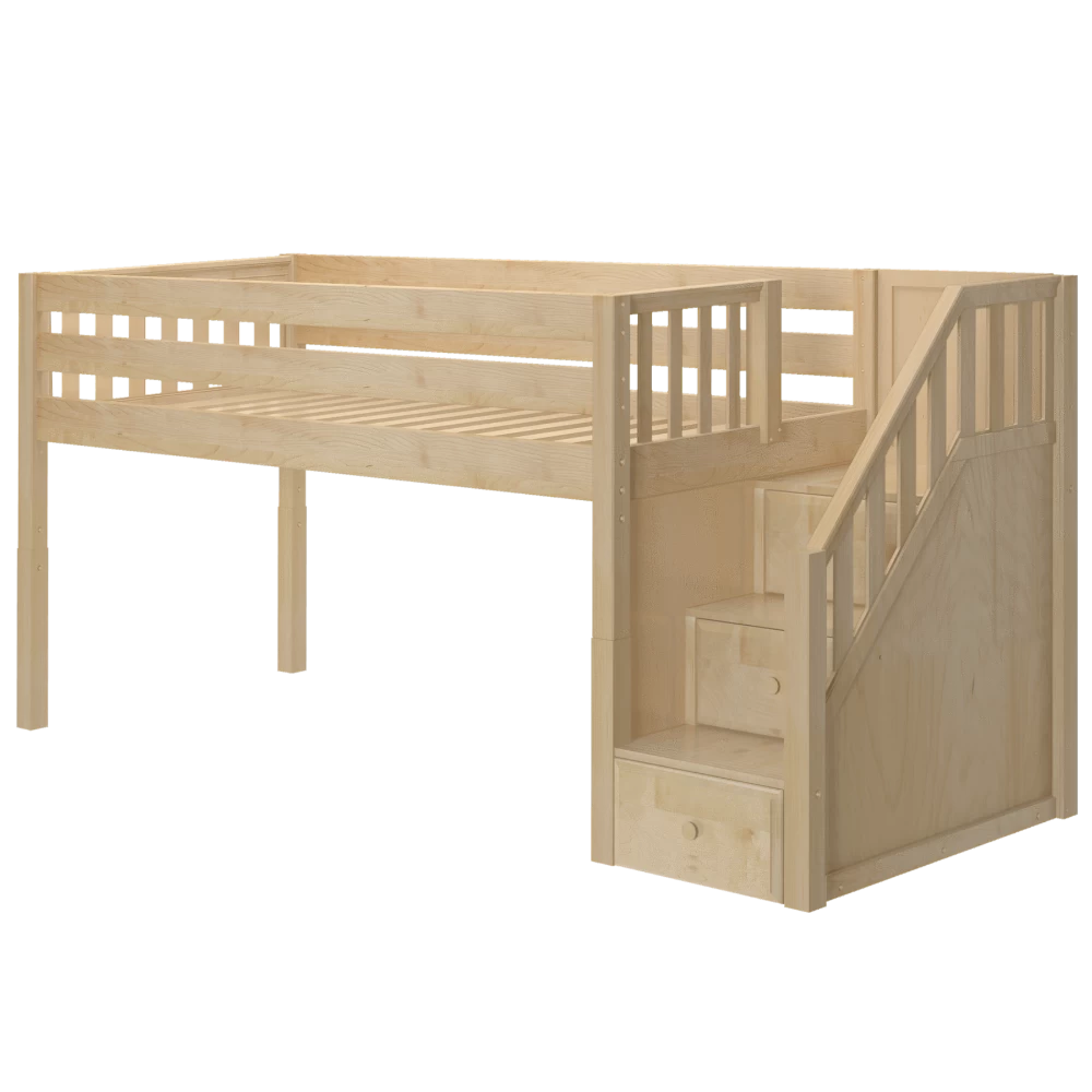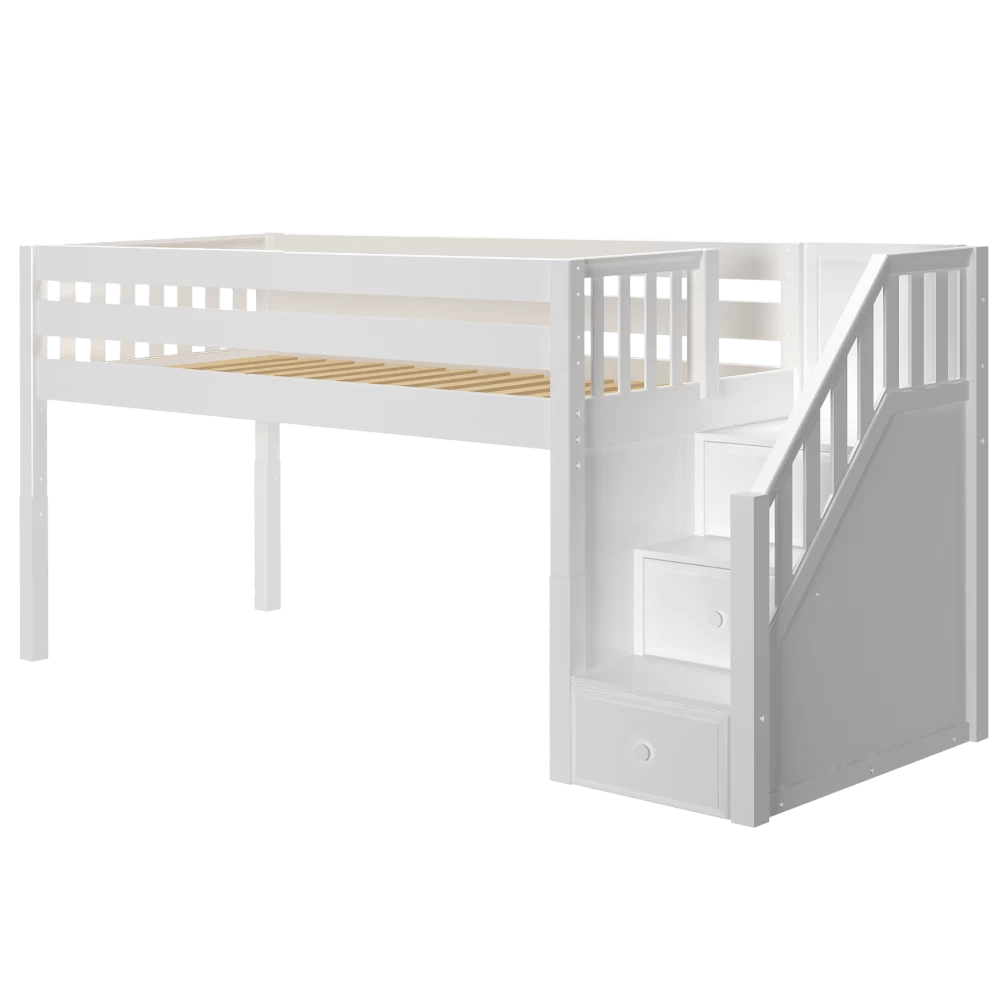 Our best-selling low loft bed with stairs is now offered in extra-long to accommodate longer legs! Twin XL loft bed = standard twin width (42.5”) + additional 4” length (84”). Requires Twin XL mattress.