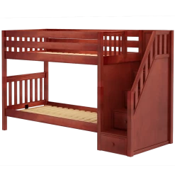 Our medium height bunk is the perfect happy medium! Designed with more space between beds, but still fits average ceilings. Stairs are a safe way for young children to climb into bed + plenty sturdy enough for adults. Each step doubles as storage drawer, great for clothes or toys. Twin XL size = additional 4” length (84”).