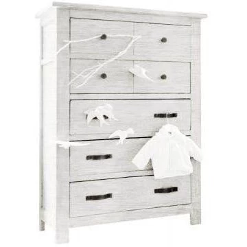 Milk Streetās Relic Tall Chest / 5-drawer dresser boasts thick, chunky posts, rustic luxury and optimal function. Transitional. Gender neutral. Filled with features for optimal function. Its organic, distressed finish and unique, metal hardware add the perfect details to this versatile piece; complete with top drawer dividers for added organization!