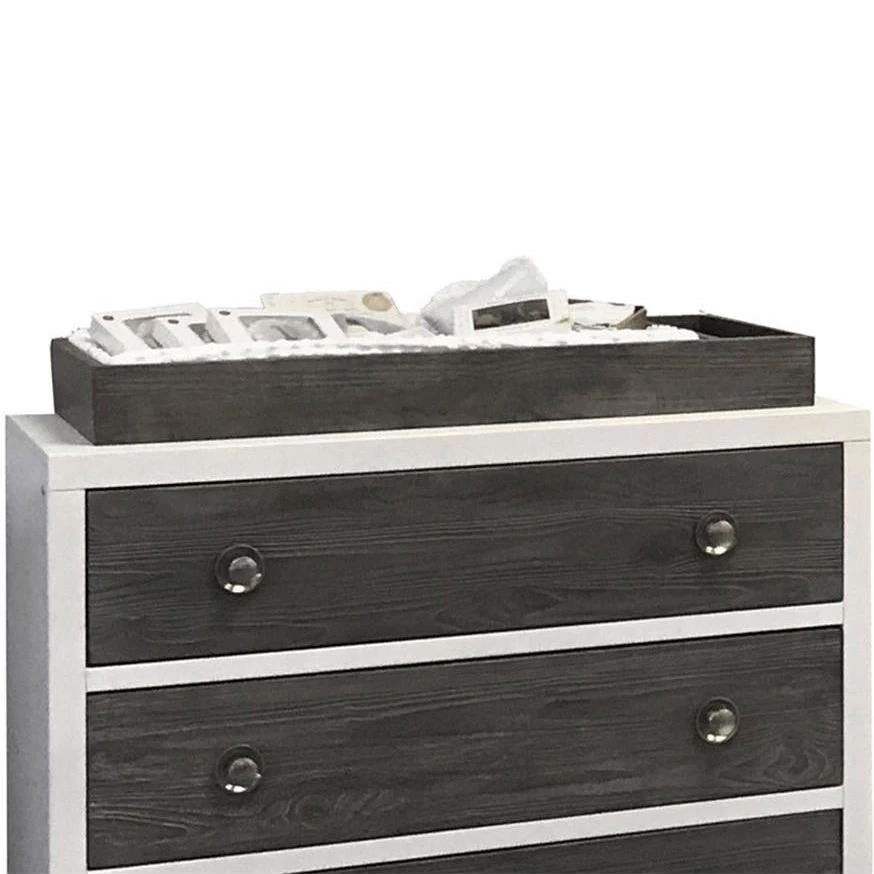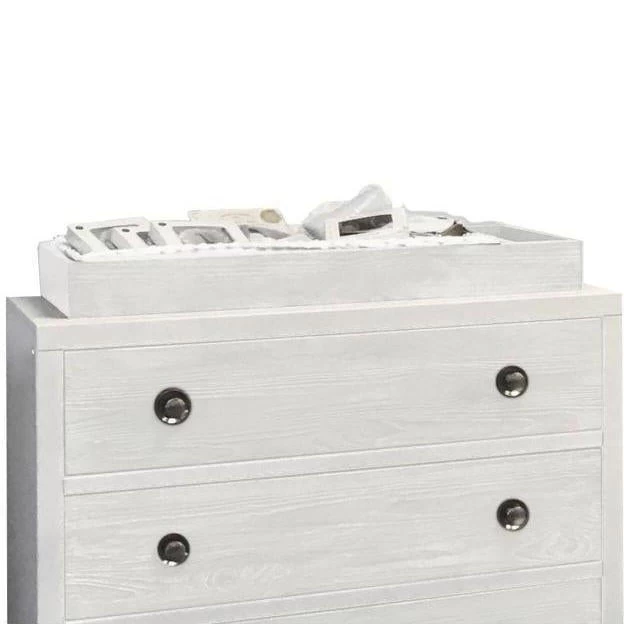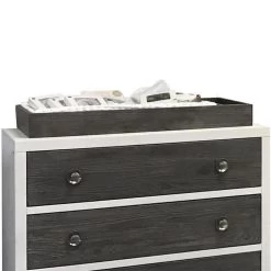 Use Milk Street’s removable tray to house a changing pad and convert your 3-drawer dresser or 6-drawer dresser into a changing table/ dresser combo. The changing tray works beautifully with either dresser depending on the size of your nursery. The underside of tray is covered with a thick felt to protect the top. Mounting hardware is included to secure your tray. We strongly recommending getting a standard pad with safety strap attached for added security while in use. We have also just added a second piece of hardware which allows for our changing tray to be used along with the hutch. Another feature few companies think about! Remember to always keep your baby within arm’s reach while changing and never leave them unattended.