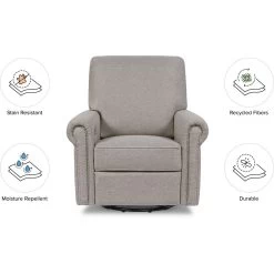 The Linden Power Recliner blends comfort, convenience, and style in your nursery space. With a soft pillowback and cozy armrests, the chair provides a space to unwind throughout the day, while the elegant nail head details add a thoughtful touch to its classic silhouette. The Linden’s electronic reclining mechanism allows you to relax at the push of a button and its USB port keeps you charged while you rest with your baby. With a back-and-forth swivel and 360-degree glide, you can rock your baby to sleep with ease.