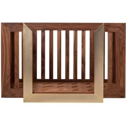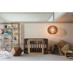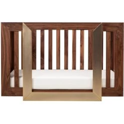 A 24 karat gold square base elevates the floating frame of the Lydian crib. The satin sheen of the gold boldly contrasts the richness of the American sourced solid black walnut. Each piece is bench-made in a small batch production using hand-selected wood in Los Angeles. Inset end panels are constructed from walnut plywood to preserve the interior structure of the crib. One step removal of the front panel converts crib to toddler bed. Made in the US.