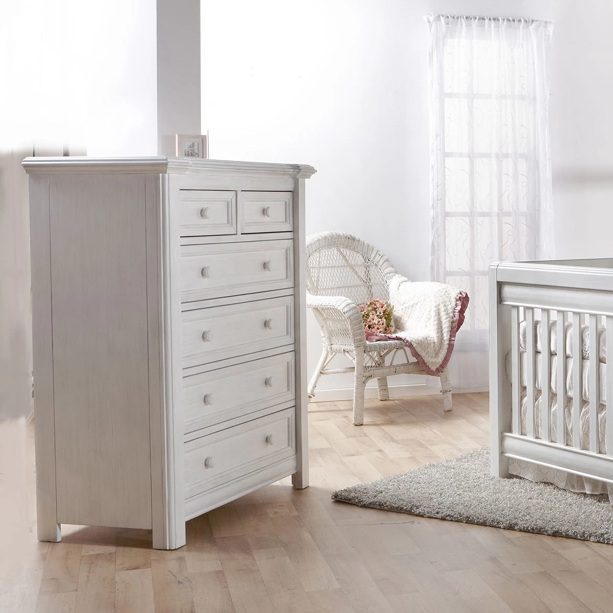 This classically styled 5-Drawer Dresser is a perfect complement to your little one’s sweetly styled haven. The layered lines and curved moldings that surround the top edge of this dresser reflect both elegance and refinement with a little bit of flare. With four large soft-closing drawers and two small ones at the top, this piece has plenty of storage space and allows for you to carefully tuck away both small and more bulky items, all while keeping fragile belongings out of reach. Like the rest of the Cristallo Collection, the Cristallo 5-Drawer Dresser, is full of texture and shine, providing both elegance and space to store the precious things that belong to the light of your life.Â
