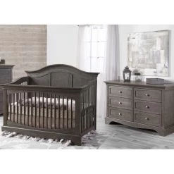 With curved moldings and rounded dowels complimented by vertical accents on the headboard, the Enna Forever Crib is a charming blend of whimsy and classical design. The curved edges that line the rounded dowels along the front of the piece provide a simple elegance and an open, window-like design. Accented with a curved foot piece, the many details of this crib work together to create a wonderfully delightful combination of style and charm that is the perfect centerpiece for any nursery. While this crib is a beautiful piece that would work nicely with any number of our nursery collections, the classically styled molding and curved accents make the Enna Forever Crib especially suited to coordinate well with pieces from both our Ragusa and Volterra Collections.
