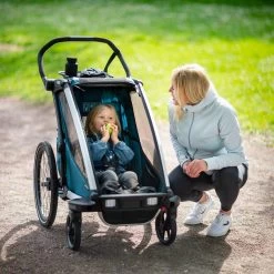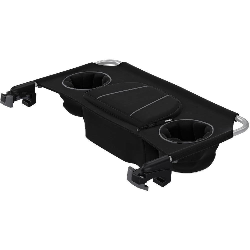Add a zippered pocket and built-in cup holders to your Thule double child carrier.