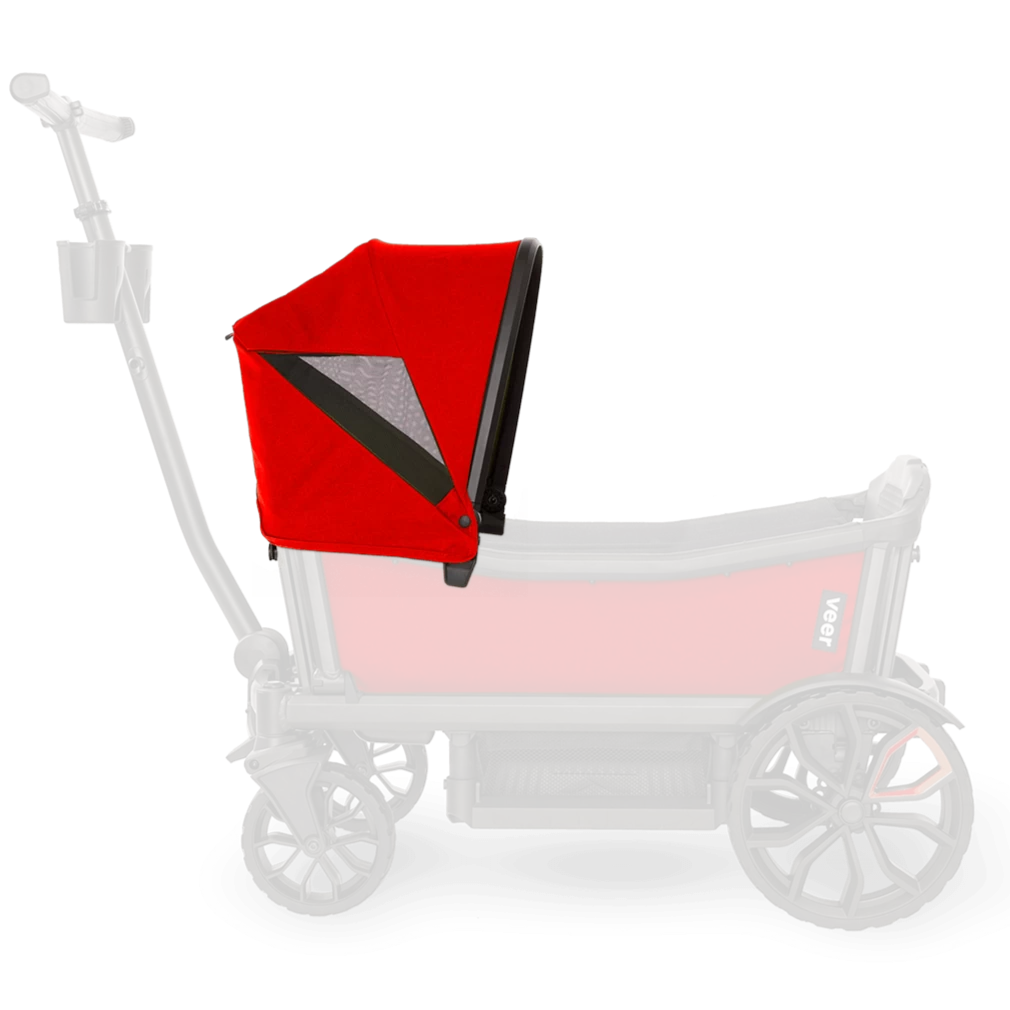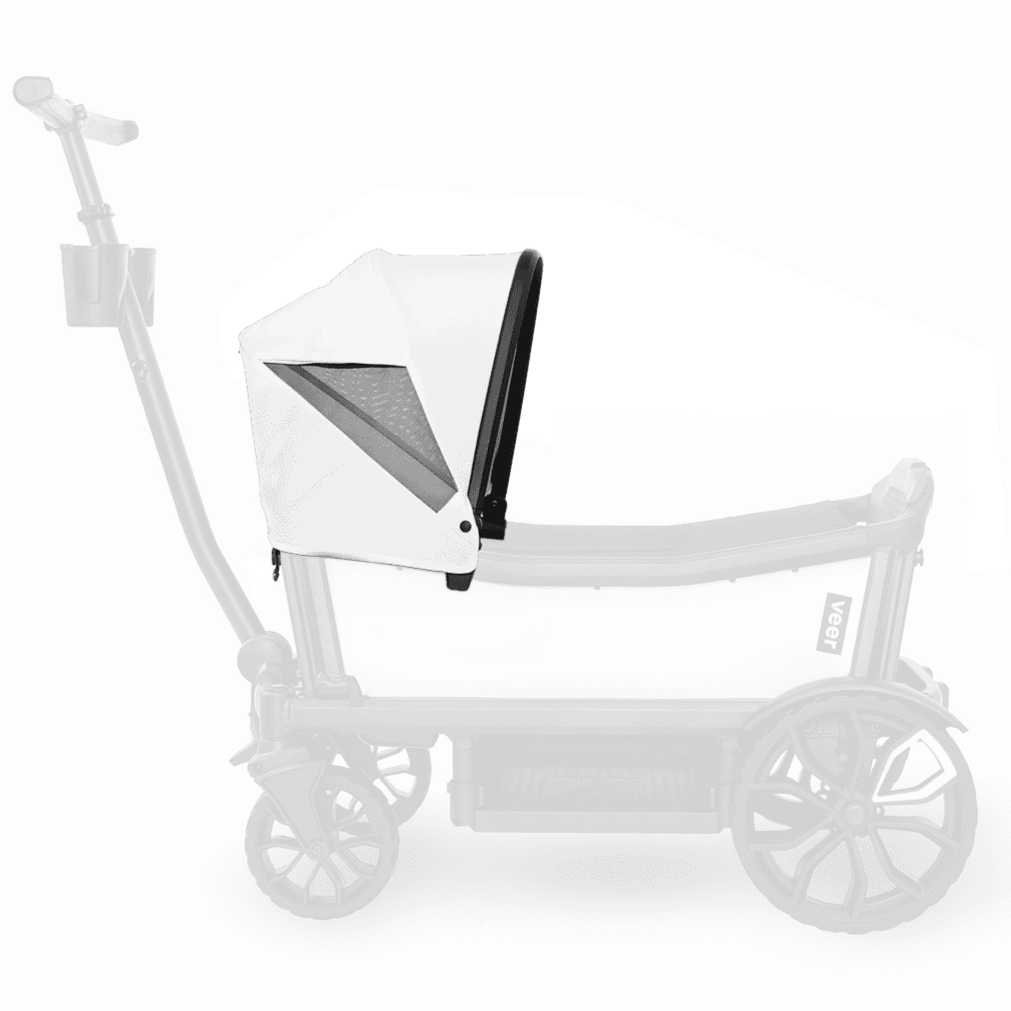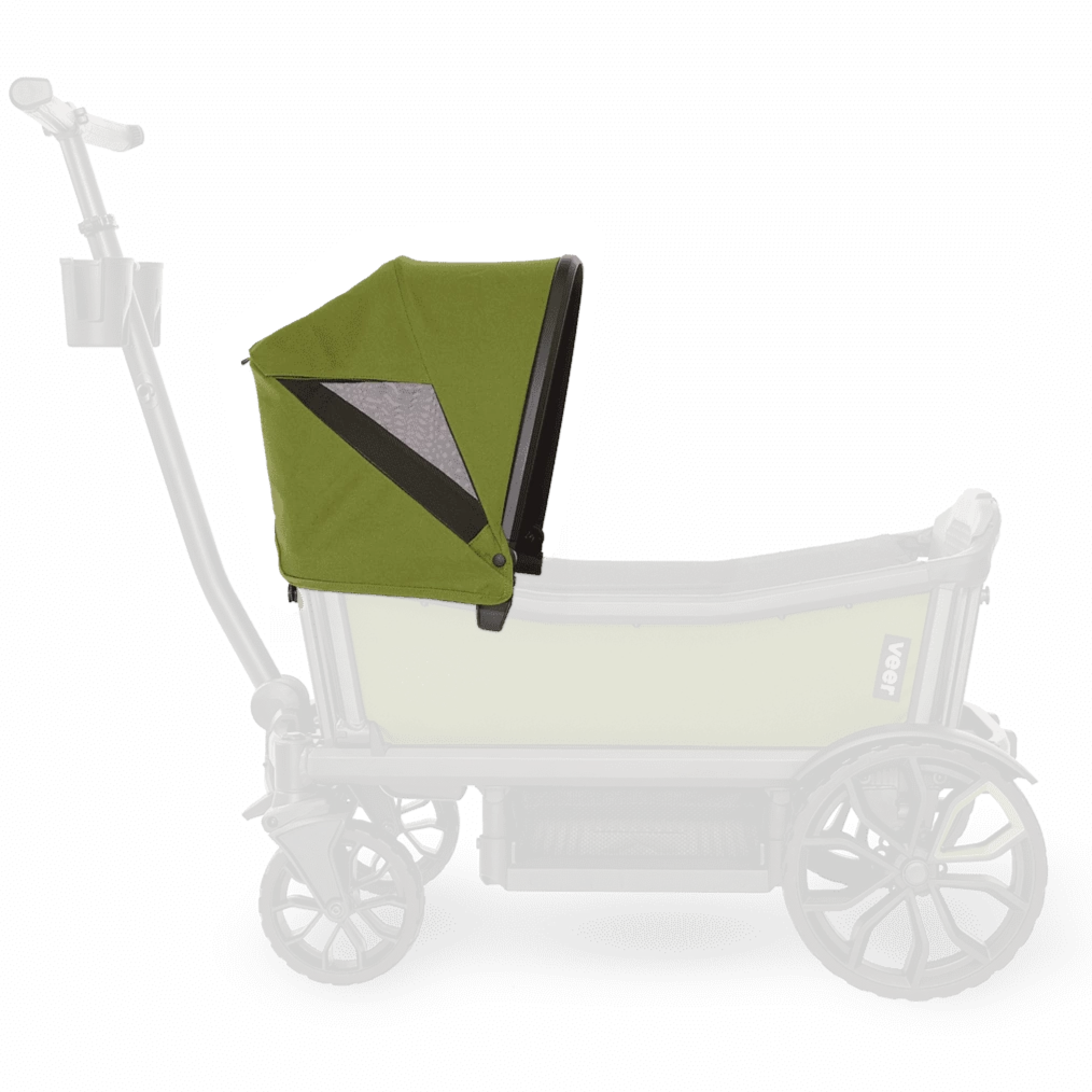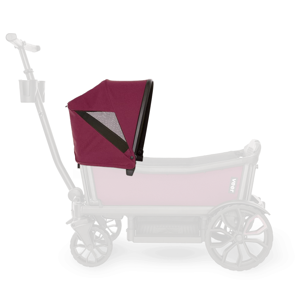 Pop goes the color with Veer’s Kai Blue Retractable Canopy. It coordinates well with Veer’s original Heather Gray and all Veer accessories. Designed just like our original Retractable Canopy, it quickly and intuitively clips onto Cruiser’s frame and easily extends up and down. Like all Cruiser sidewalls and canopies, Kai Blue is easy to keep clean. Hose wash or, for tougher stains, use a bit of mild dish soap and a soft brush or cloth to clean. One or two can be attached, above either seat. A peak-a-boo window allows you to see your precious cargo and discreet, and hidden magnets hold the window in the up position. Canopy works perfectly with Napper to create the perfect rest stop for young ones, or with Bug Shield to add insect protection.