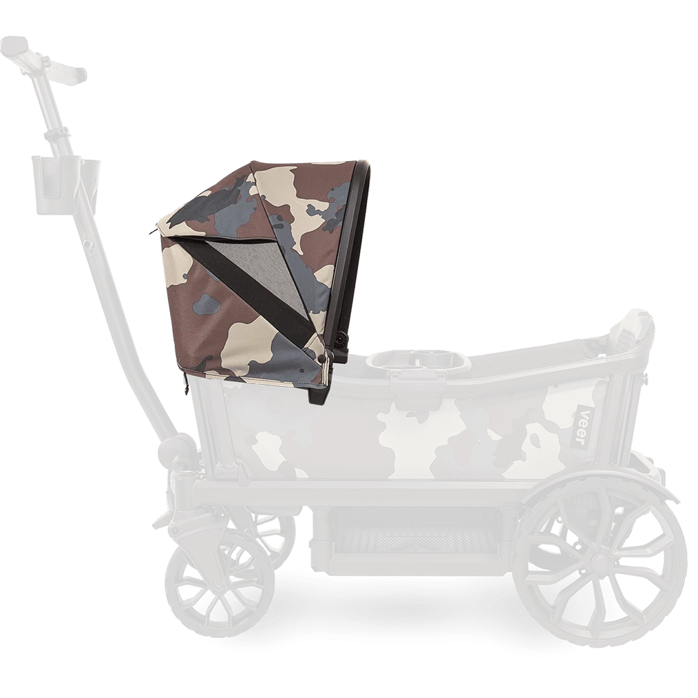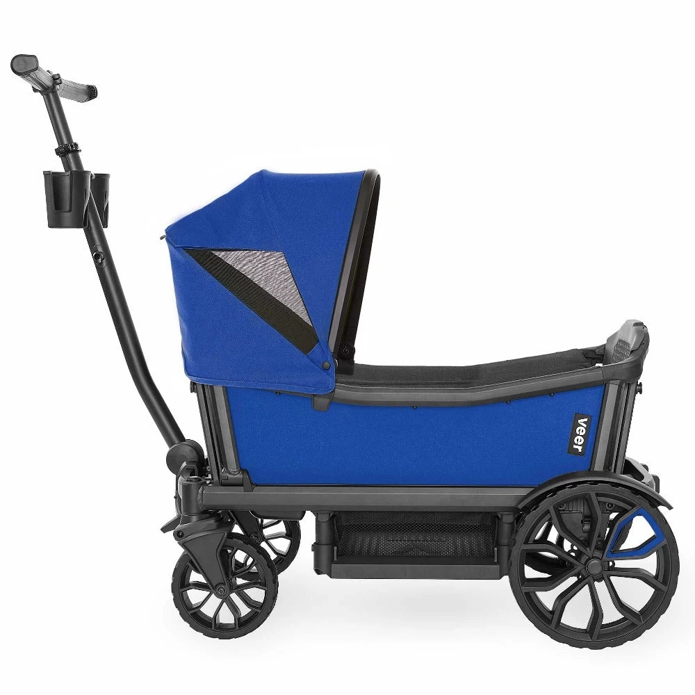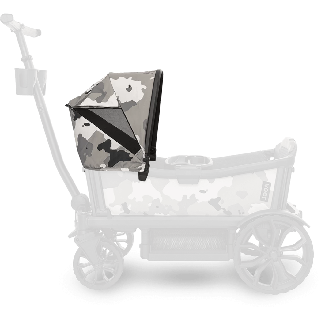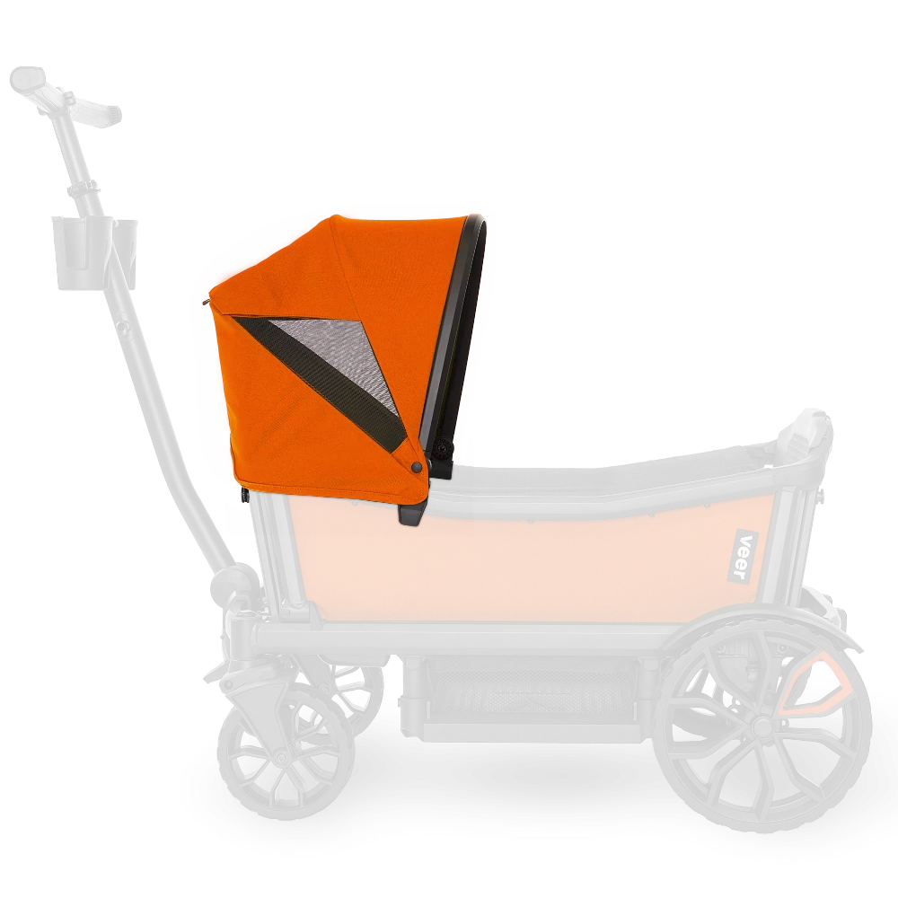 Pop goes the color with Veer’s Kai Blue Retractable Canopy. It coordinates well with Veer’s original Heather Gray and all Veer accessories. Designed just like our original Retractable Canopy, it quickly and intuitively clips onto Cruiser’s frame and easily extends up and down. Like all Cruiser sidewalls and canopies, Kai Blue is easy to keep clean. Hose wash or, for tougher stains, use a bit of mild dish soap and a soft brush or cloth to clean. One or two can be attached, above either seat. A peak-a-boo window allows you to see your precious cargo and discreet, and hidden magnets hold the window in the up position. Canopy works perfectly with Napper to create the perfect rest stop for young ones, or with Bug Shield to add insect protection.