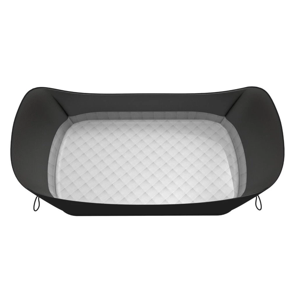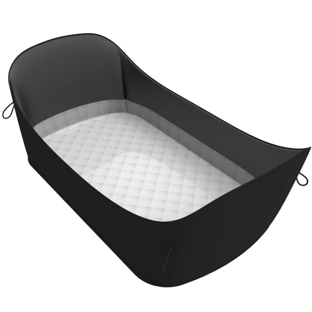 Veer’s Nap System turns your Cruiser into a JPMA safety certified Bassinet, making your Cruiser the ultimate rest stop or changing station for young ones. (The Nap System is suitable from birth up to 20 lbs. [9 Kg] and/or 27” [69 cm], whichever comes first or until your infant pushes up on their hands and knees.) A soft, removable mattress pad is included. The Nap System includes magnets built into its cleanable sidewalls that keep it snug to the Cruiser sidewalls, and includes four bungee connection cords that attach to the seat backs to keep little ones safe. A bug shield that zips on a sun canopy to cover the Cruiser is included (retractable sun canopy sold separately). The Nap System makes a great changing station as well. The Nap System compactly folds up into a storage bag that mounts to Cruiser and it also fits in the Foldable Storage Basket when not in use.